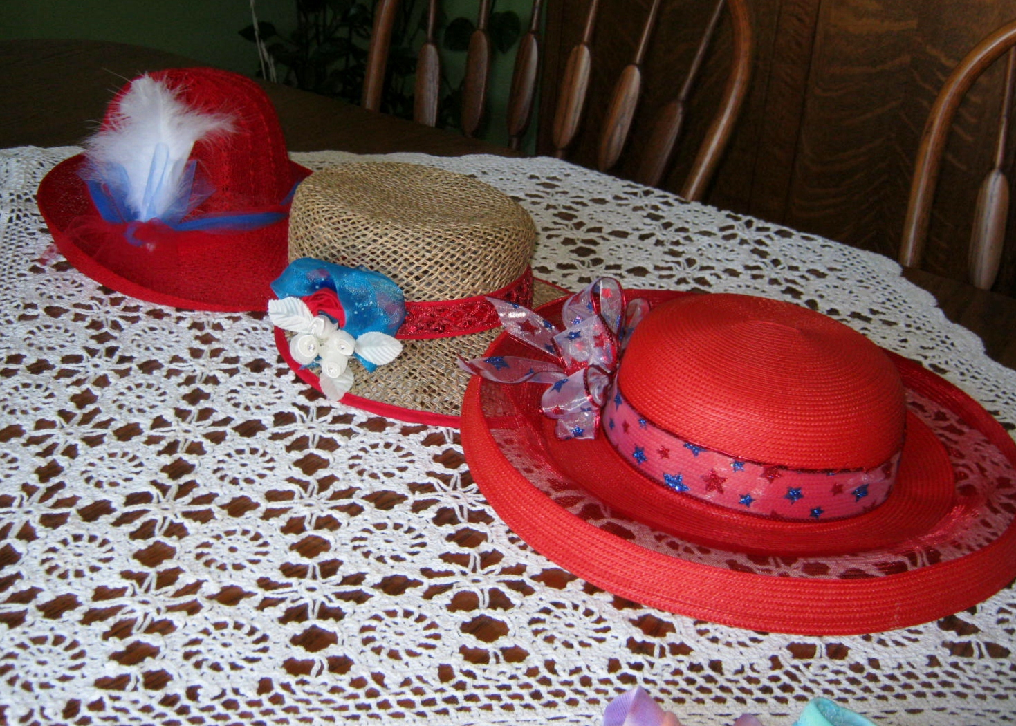 I decorated some hats for my Mother-In-Law and her friends to wear on the Fourth of July. She and my Father-In-Law are part of a handful of original members of their church congregation who are riding on a float in the local parade. One of the techniques I used was melting the edge of sheer polyester to prevent raveling and give the blue flower a decorative look. Below is a quick tutorial on how to do this with ease.