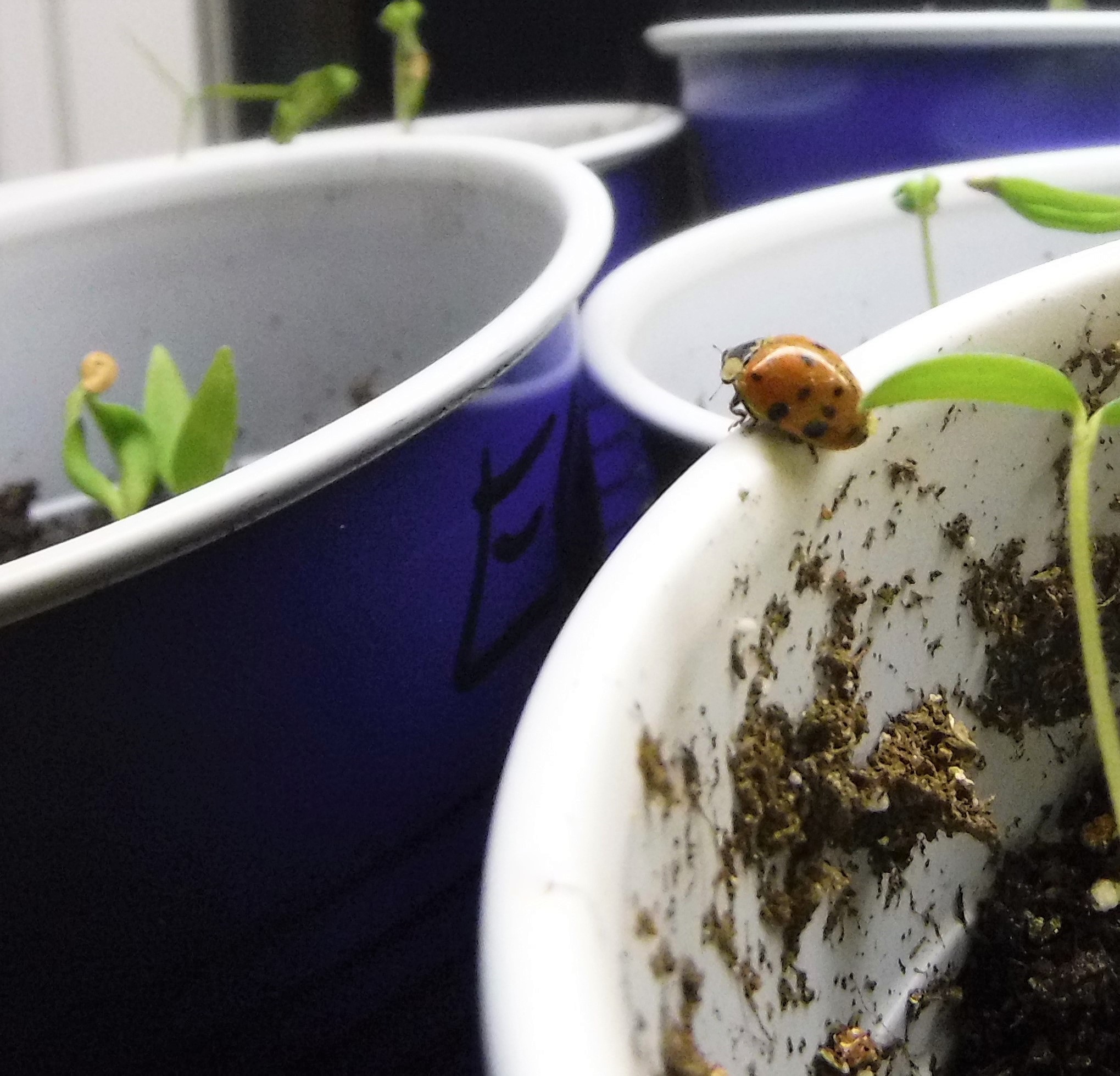 I don’t like stink bugs, but I love ladybird beetles. They also find their way into the house in the winter, but are welcome guests. I found one on my tomato sprouts and was so enamored I took a dozen photographs of her as she traversed the top of the party cups. Sweet!