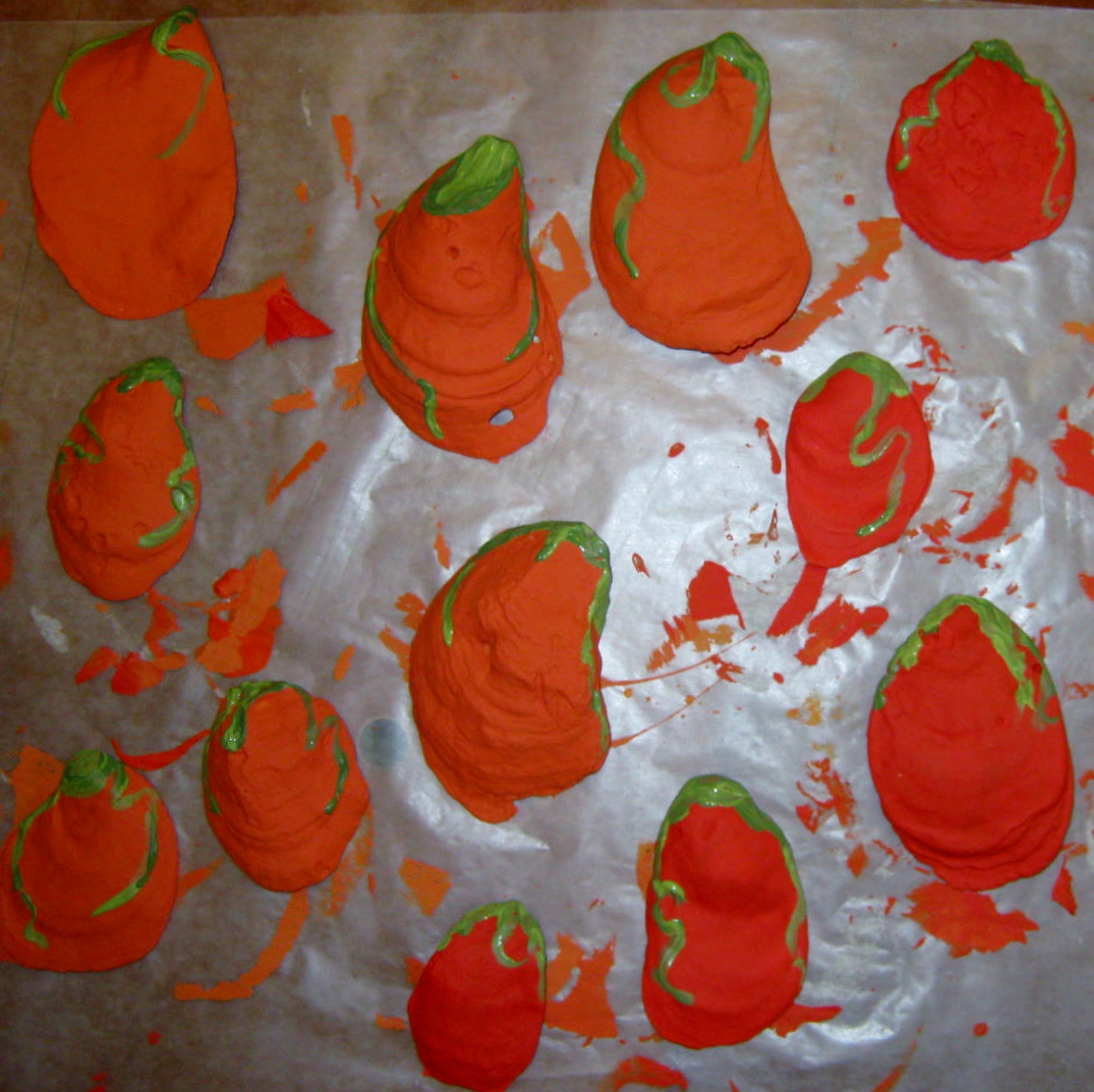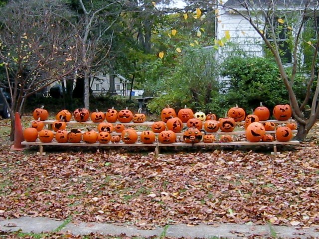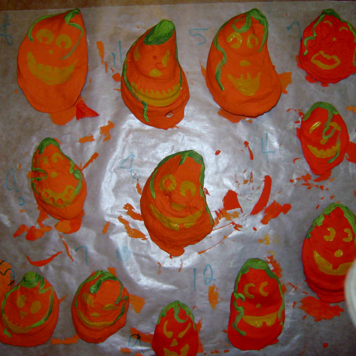 Here’s a photograph showing several of the pumpkins with stems and vines painted on.