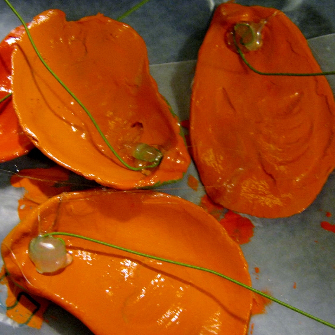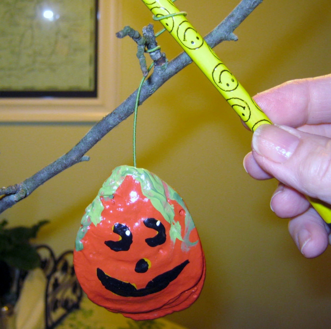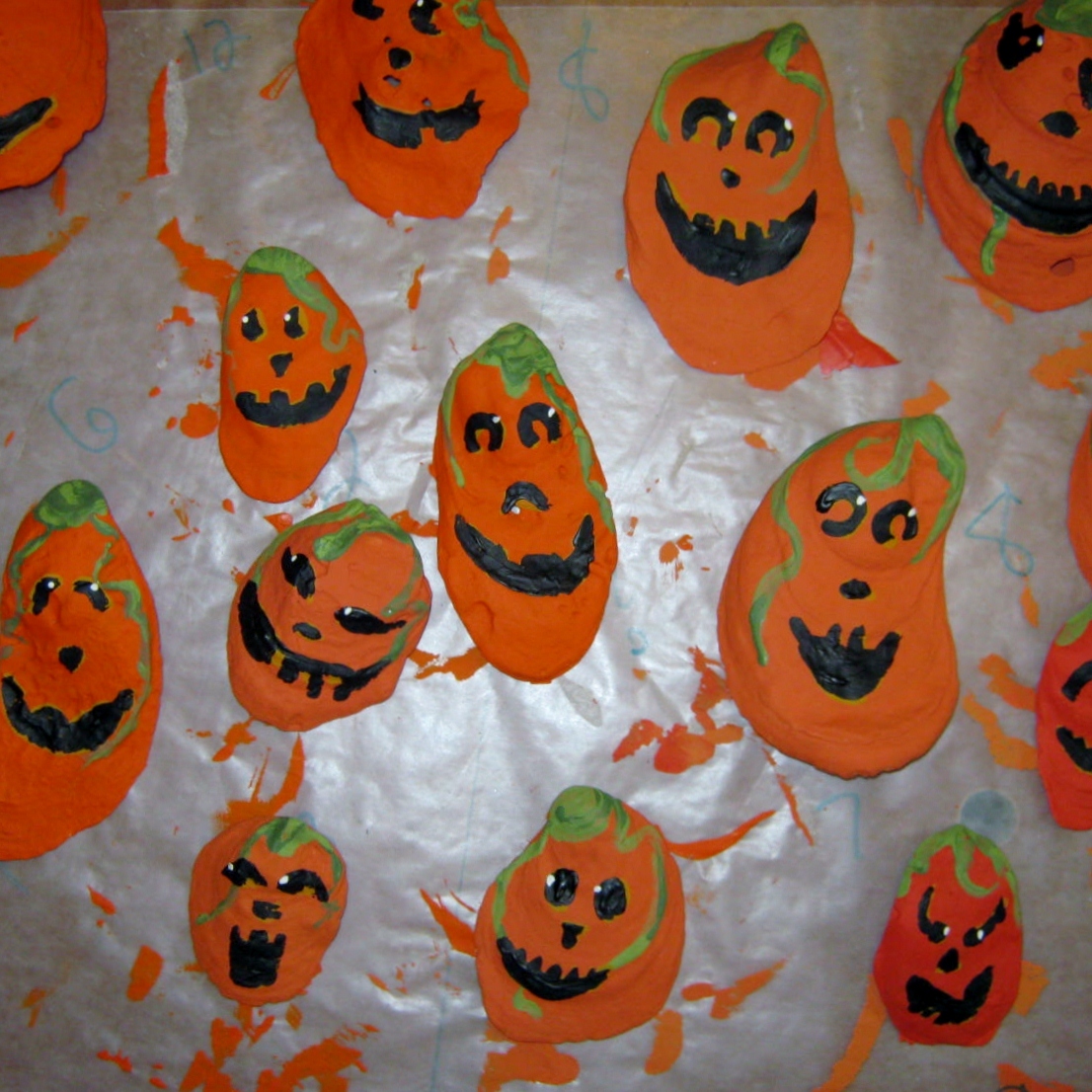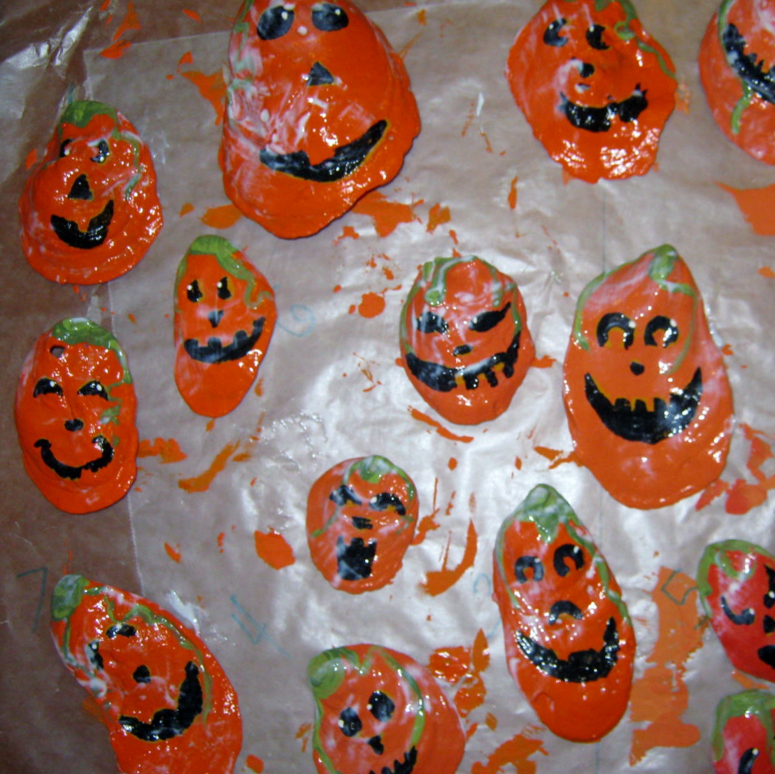 I’ve mentioned in previous posts that I am an incurable beachcomber. Recently, part of my shell collection has become a project for Halloween. I’ve seen oyster shells fashioned into Santa Claus ornaments with a bit of paint, and I imagined turning my shells into Jack O’ Lanterns. The shells are oblong and oval, much like a real pumpkin. They have a bumpy, lumpy, wavy surface, another commonality with a pumpkin.