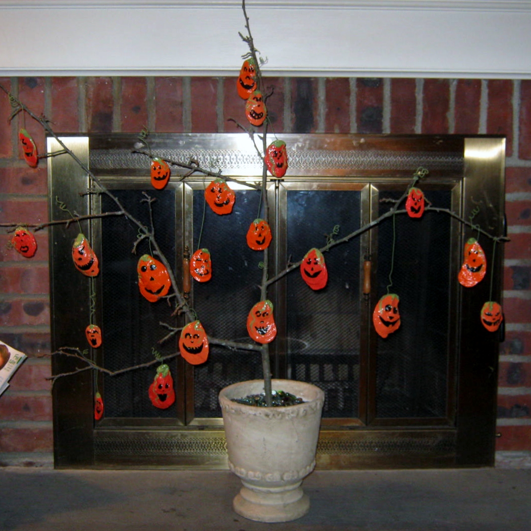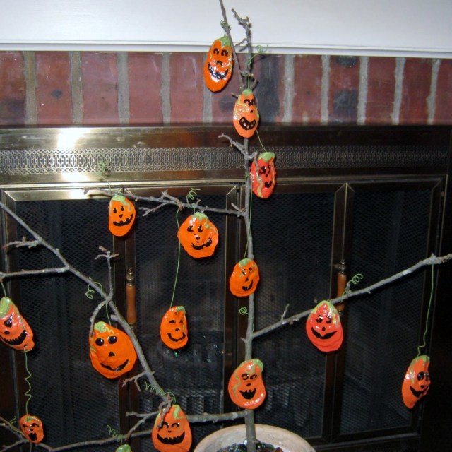 The next step was a coat of glossy mod podge. Part II will be tomorrow’s post. Check back for the finished Jack O’ Lantern Halloween tree.