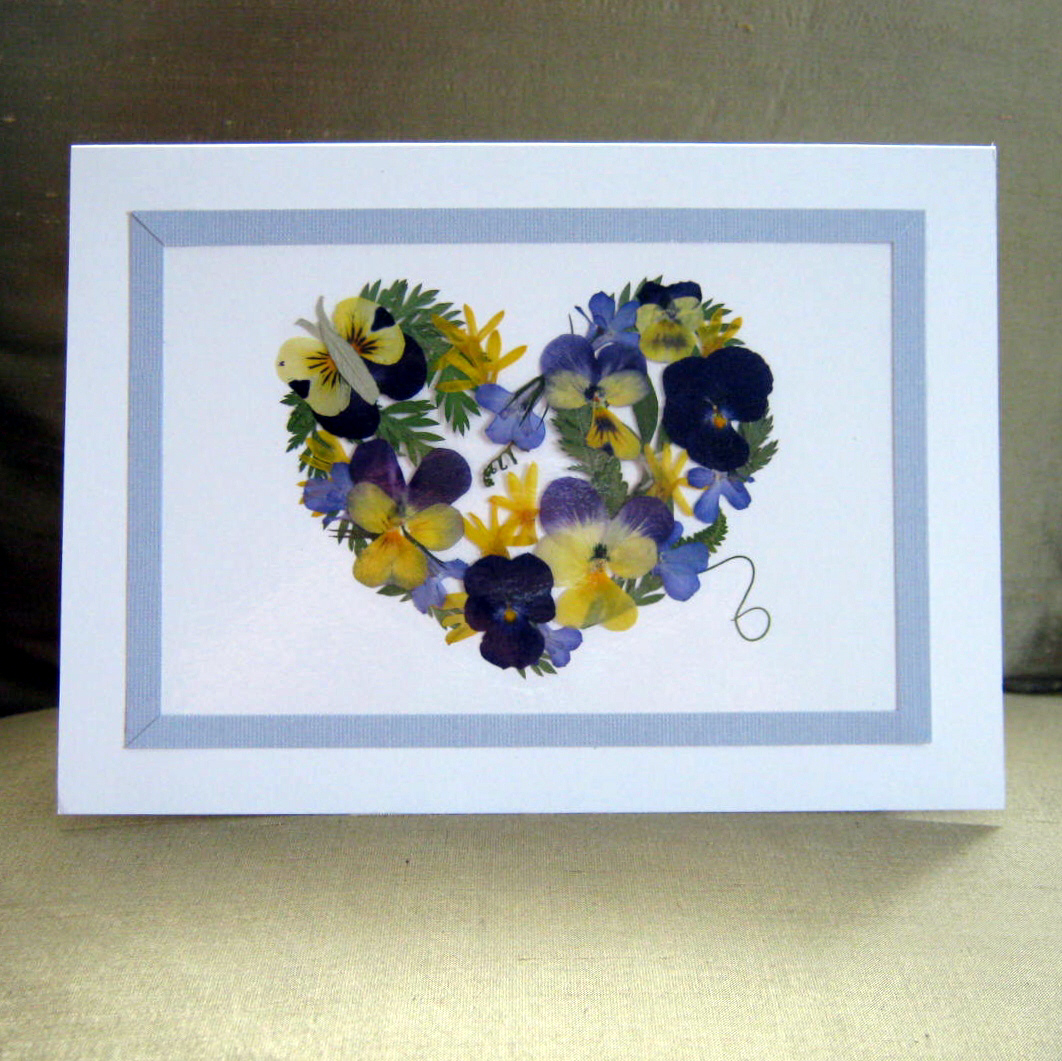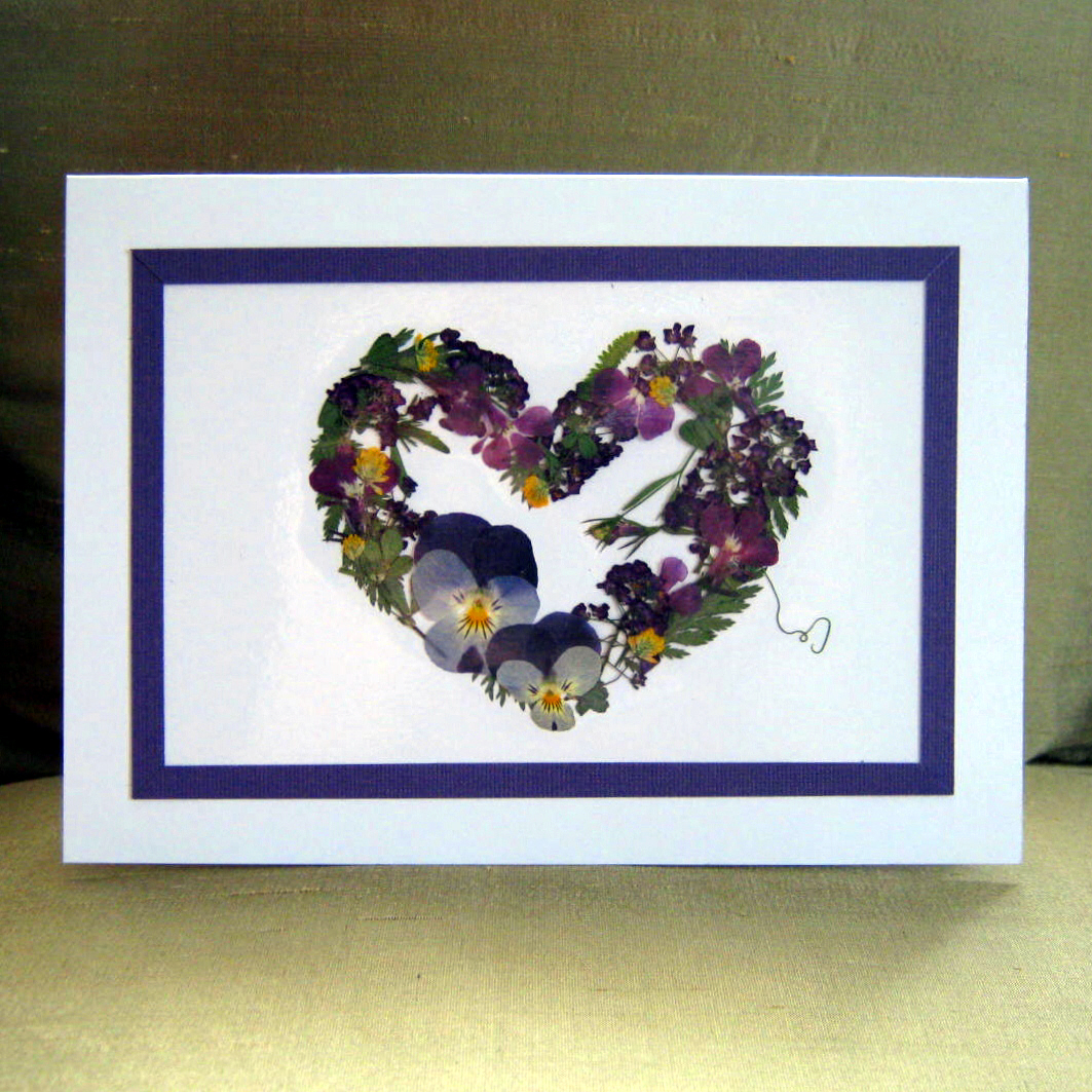 I have quite a stockpile of pressed flowers ready to use for greeting cards and other projects. I love creating these unique cards. The heart in the photograph above has a small butterfly in the top left hand corner. I was pleased with the way it fit into the theme of the card.