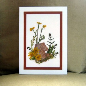 I have several birthdays, some graduations and other events in the next few weeks that will need a card. I haven’t found a way to make these card appear masculine, so I bought two male-themed graduation cards instead. (Cringe…they are so overpriced and not unique in any way whatsoever…big sigh) If someone has ideas for masculine themes with foliage and flowers, please comment. I almost feel the card pictured below fits the bill, but not quite. Created with birch bark, ferns and subtle wildflowers, it is almost rustic, but is still a little flowery.