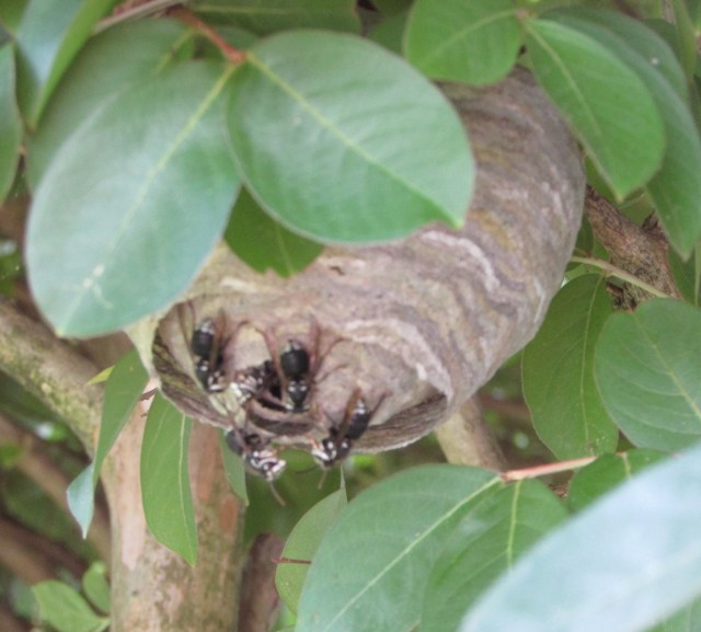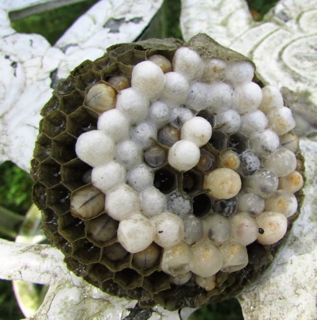 This weekend, after another heavy rain, it slipped off the branch and hit the road. I saw it in time to collect it and just might be able to salvage some of the hornet-made paper to press. I don’t need to worry about eggs inside. I know only the queen survives and hibernates in bark or other crevices until it is warm enough to start a new nest. According to Pets on Mom.me, the hornet queen never returns to the old nest. I’m hoping to discover a way to slice the egg cell paper also, and will try to press that too; I love the pattern the hornets create.