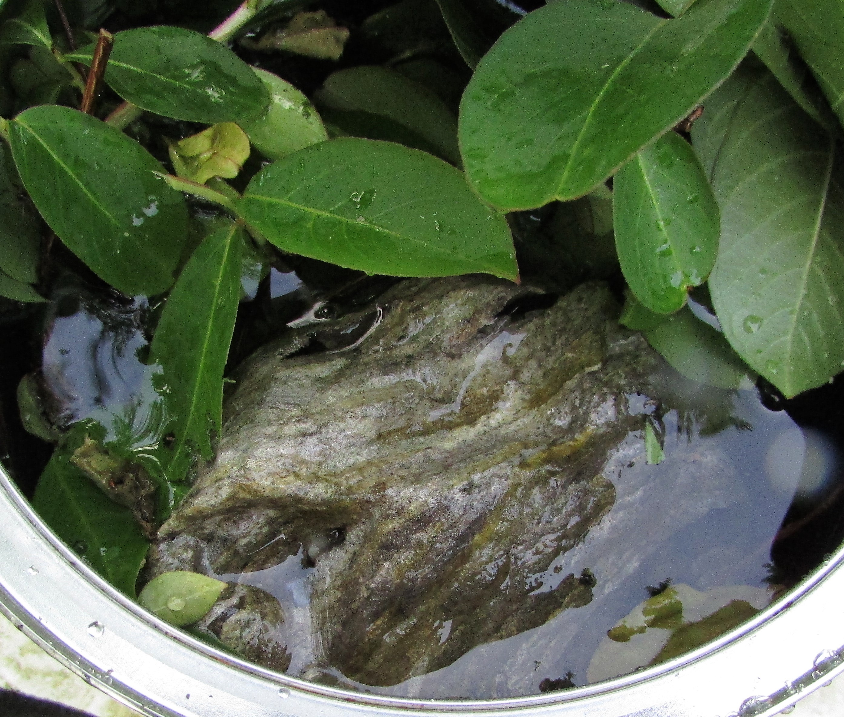 This weekend, after another heavy rain, it slipped off the branch and hit the road. I saw it in time to collect it and just might be able to salvage some of the hornet-made paper to press. I don’t need to worry about eggs inside. I know only the queen survives and hibernates in bark or other crevices until it is warm enough to start a new nest. According to Pets on Mom.me, the hornet queen never returns to the old nest. I’m hoping to discover a way to slice the egg cell paper also, and will try to press that too; I love the pattern the hornets create.