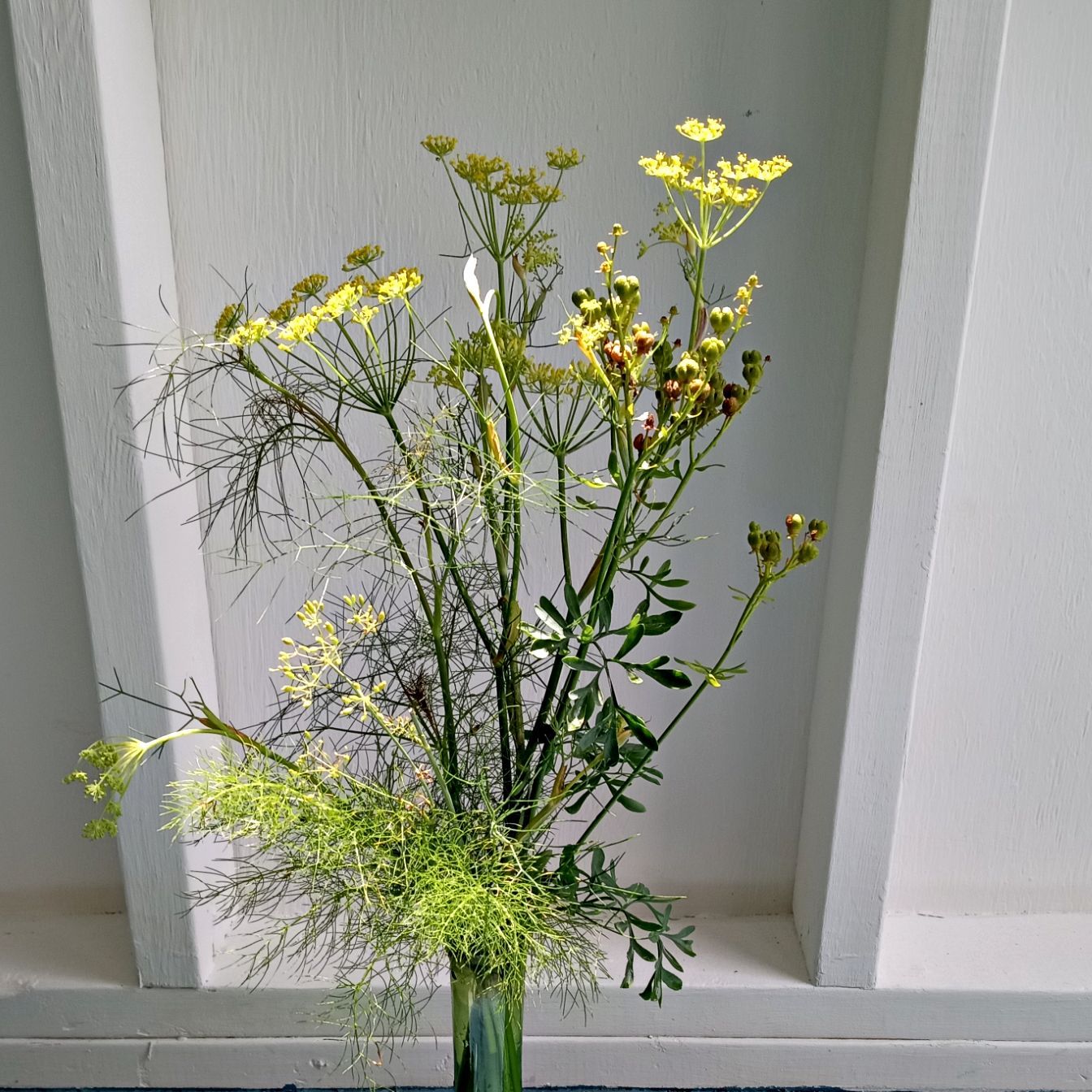 Fennel is still filling the garden beds in various heights and sizes. When I picked a few sprigs for the vase I momentarily smelled that distinctive licorice fragrance the foliage puts out. This wonderful herb is one of my major host plants for butterflies. I imagine many Black Swallowtail caterpillars on the fennel come to Spring when I daydream about my 2024 gardens.