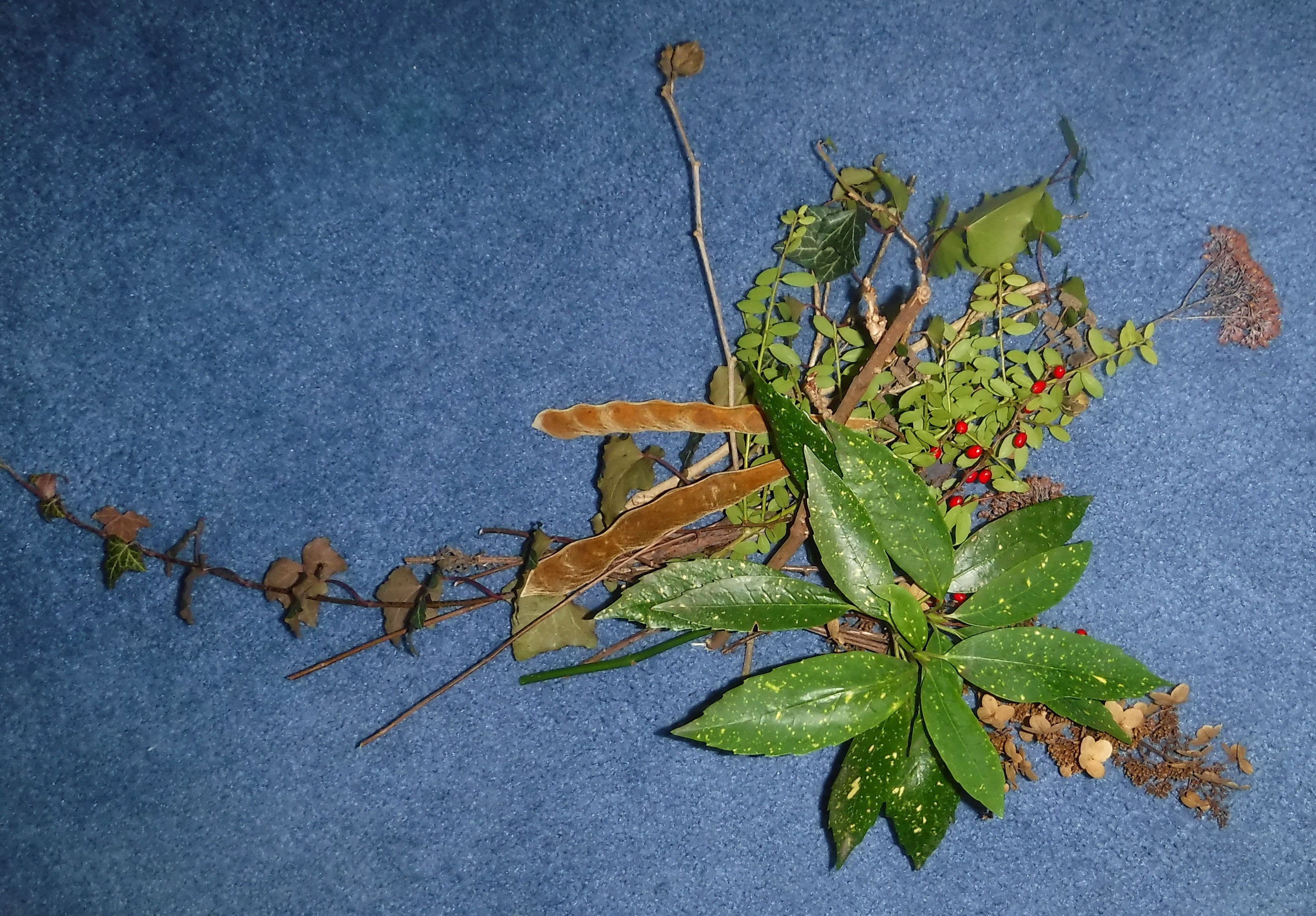 The plants used in today’s IAVOM are: honeysuckle, bittersweet berries, porcelain berries, crabapple, frost aster, autumn clematis seedpods and sassafras leaves.