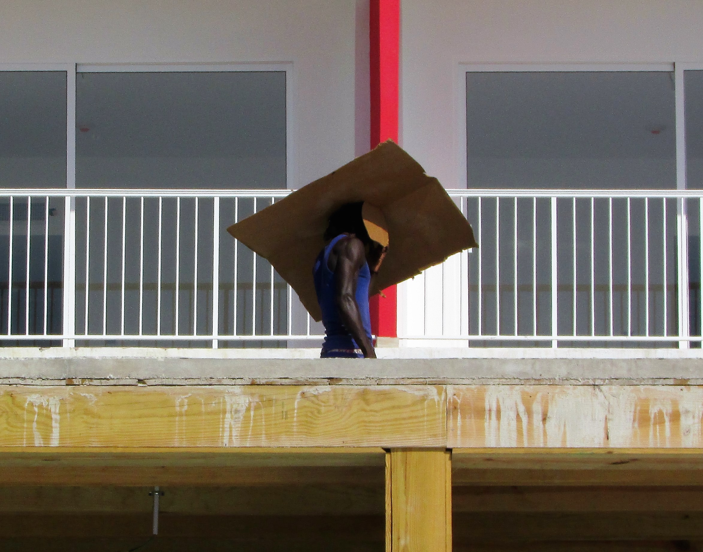 Jamaica is one of our favorite places to visit. I love the land, the sea, and most of all the people. The DeCameron, a lovely hotel in Montego Bay, is one of our favorite places to stay. They are expanding in size, and we enjoyed watching the work going on around us. We were very impressed by this man’s ingenuity in shielding himself from the hot sun with a large piece of cardboard. The cardboard is light in weight, but its broadness cast a large shadow, protecting him from the heat. I would never have thought of such a good idea, but I will definitely file it away in my thoughts as a perfect solution for blazing sunshine.