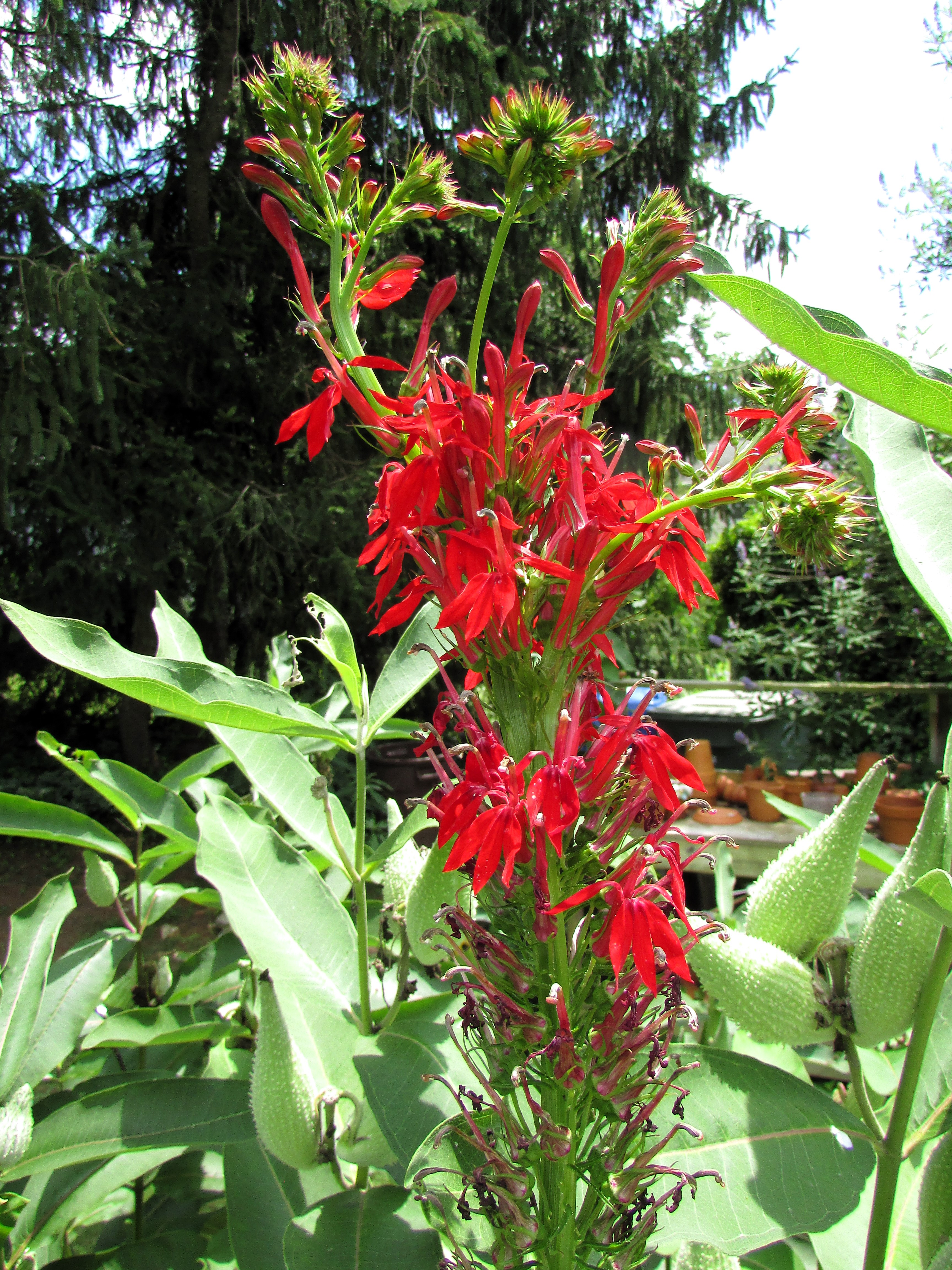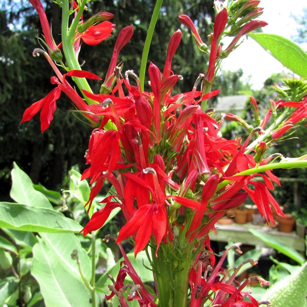 It’s not too often my husband admires a garden plant enough that it will prompt him to ask me to plant more next year. This gorgeous Red cardinal flower is a type of lobelia. I purchased it at a nursery this Spring, and it must love the location near the milkweed because it has shot up like an arrow. From a distance, when the sun lights up the red, it glows like a torch.