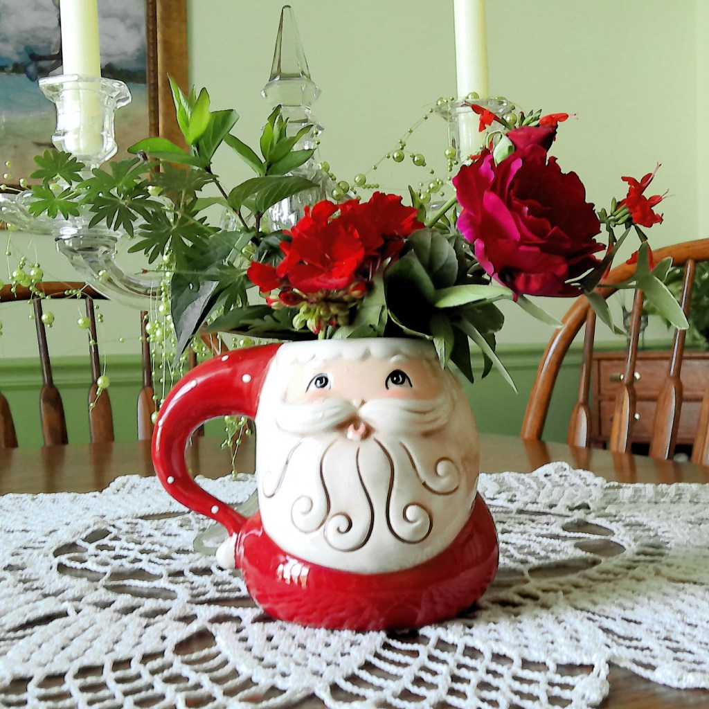 I have a happy combo post combining two blogs that offer a challenge. It is day seven for participating in Becky’s Life of B square challenge of Simply Red. I’m using the Christmas in July Santa Mug floral arrangement as part of Cathy’s IAVOM challenge on the Rambling in the Garden blog. A thank you to both of these ladies for the energy and time it takes to host challenges. I enjoy them very much!
