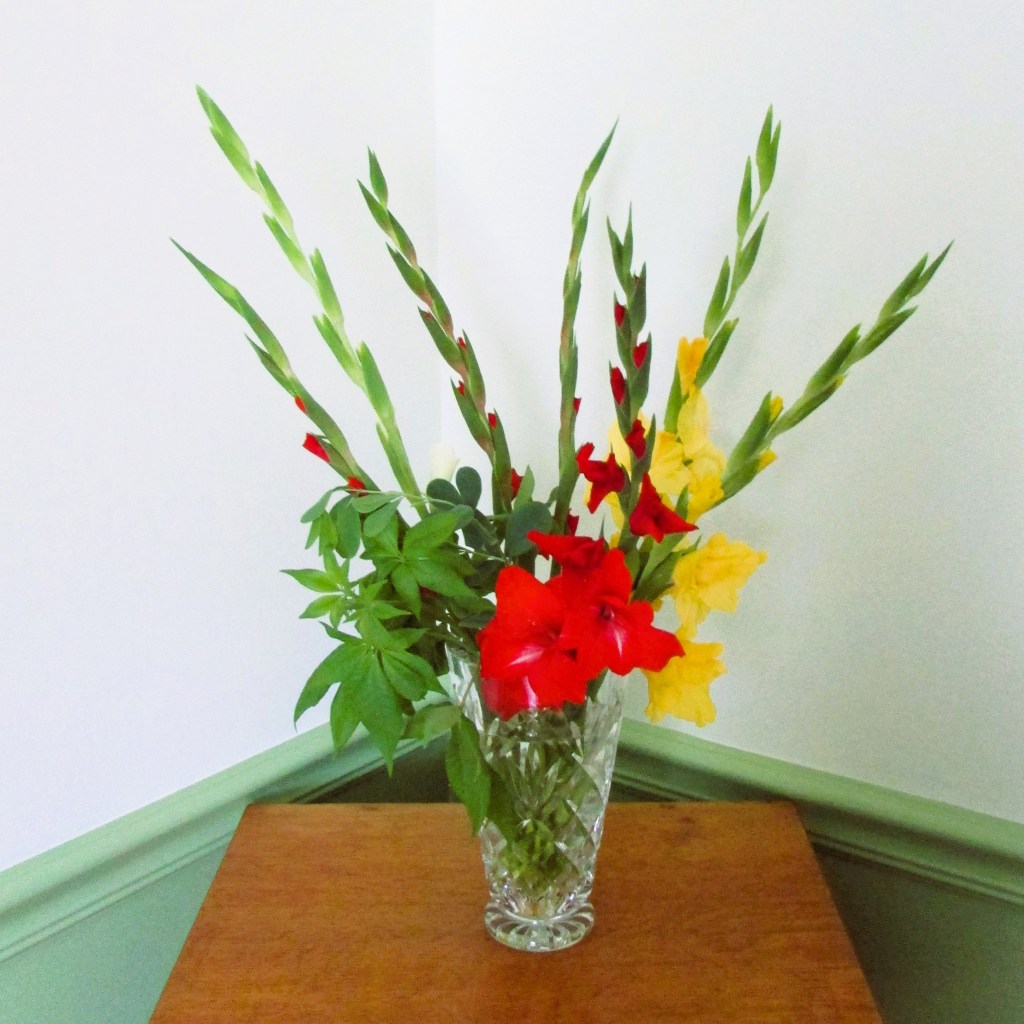 I have cut and vased almost every stem of Gladiolus so far. Only one or two have lived out their bloom time in the garden. My Glads are always floppy. I found out a week or two ago that this happens if you don’t plant them deep enough. I am already imagining where I will fit in the new Gladiolus bulbs next year. I love the bright, long-lasting bouquets I can create with them.