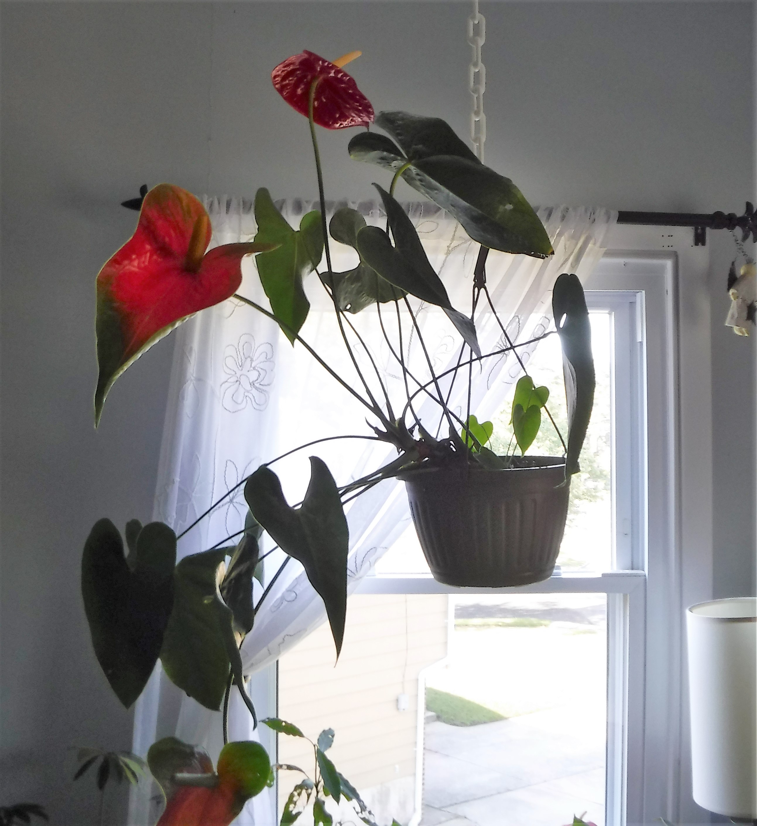 The anthurium always looked interesting in its floor pot, but as a hanging basket plant it is unique and will never look common. A good lesson for me to follow too: Always be who I am, and not what others think I should be!