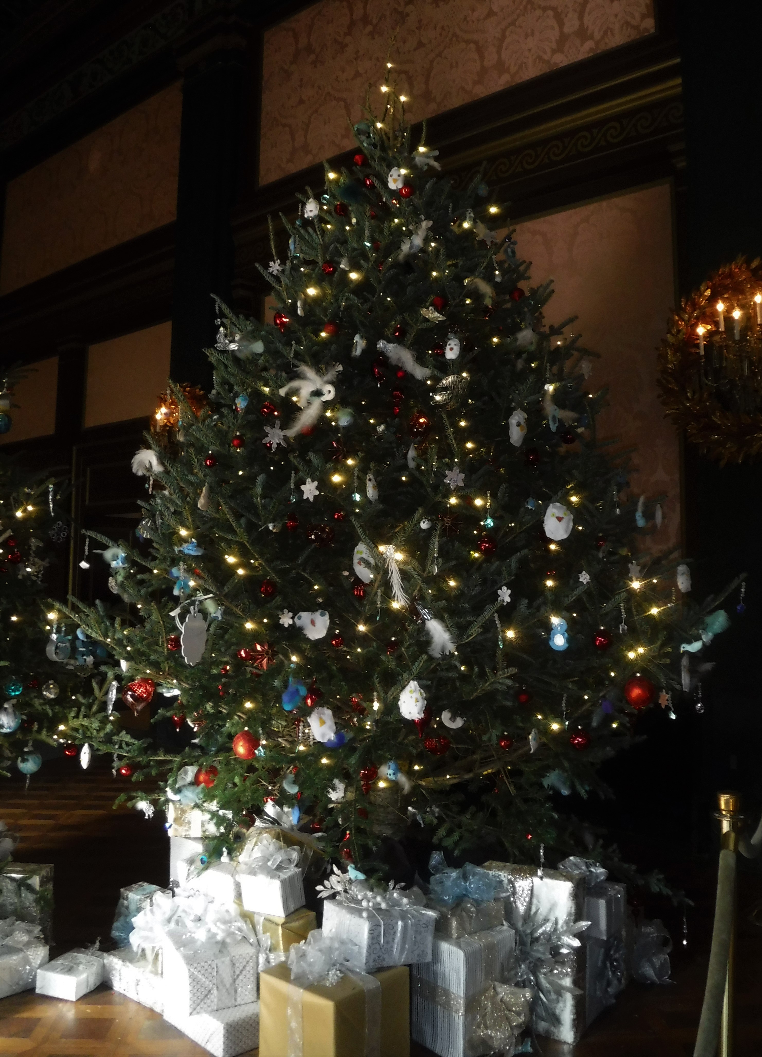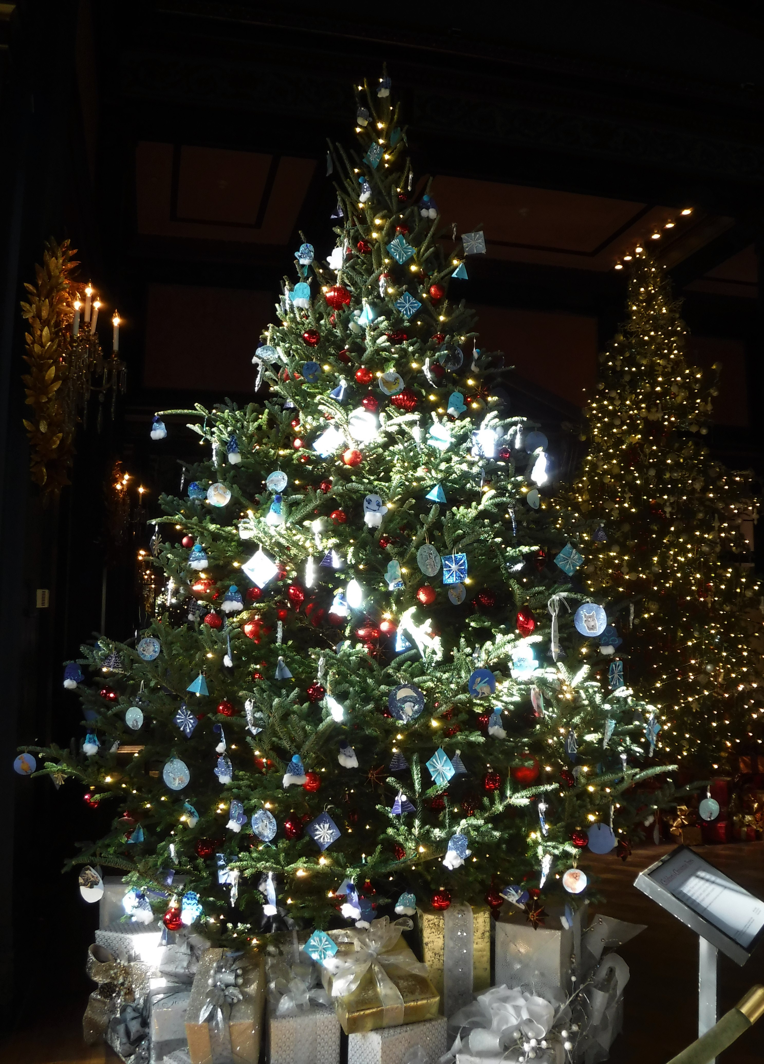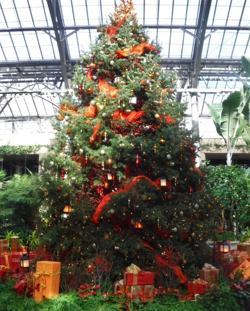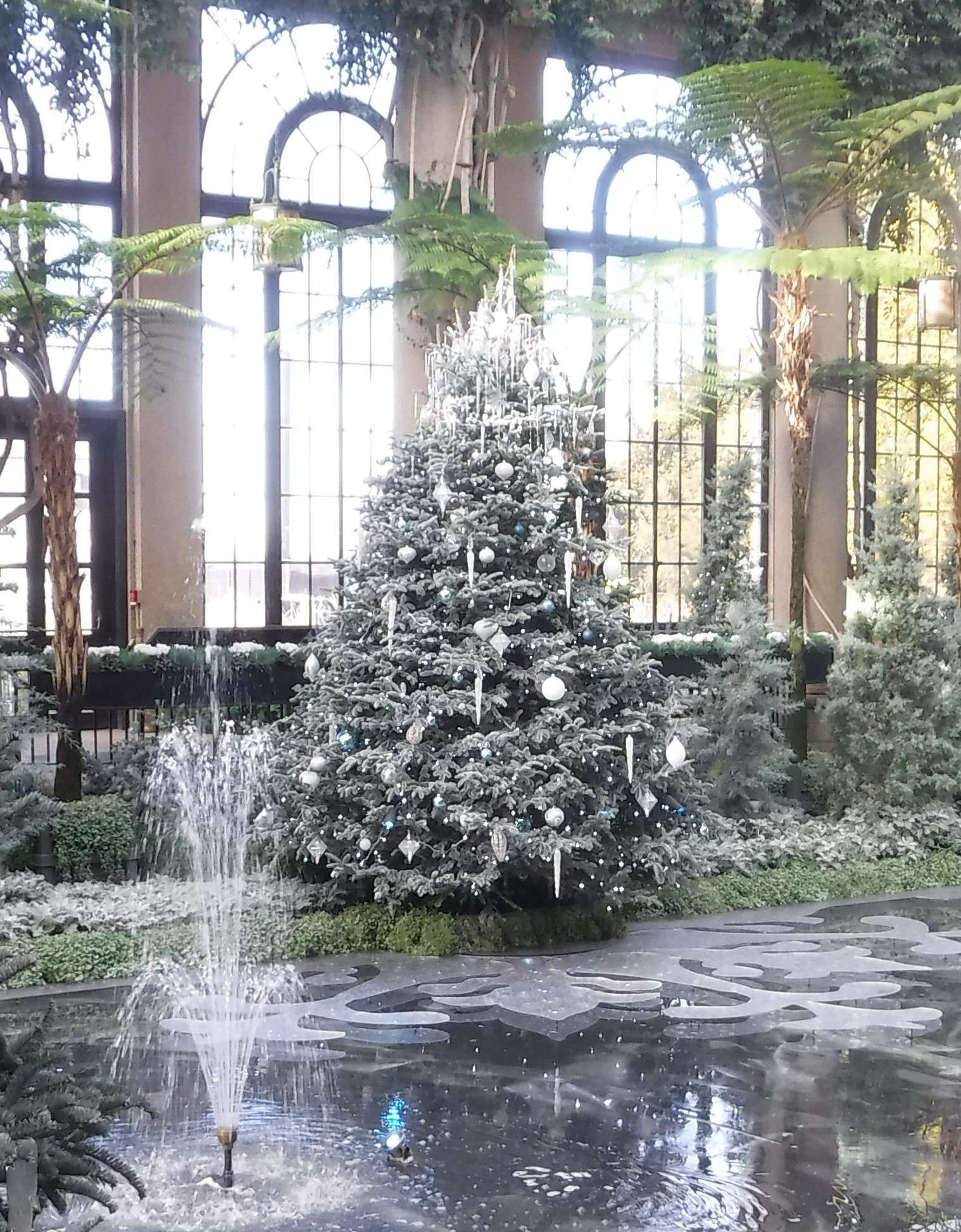 We visited Longwood Gardens this week. The conservatory was filled with Christmas trees, some elegant and designed by floral experts, a few covered with decorations created by children. All the trees were beautiful, but my favorites were in the Exhibition Hall, atop the sunken marble floor, with faux ice above the water.