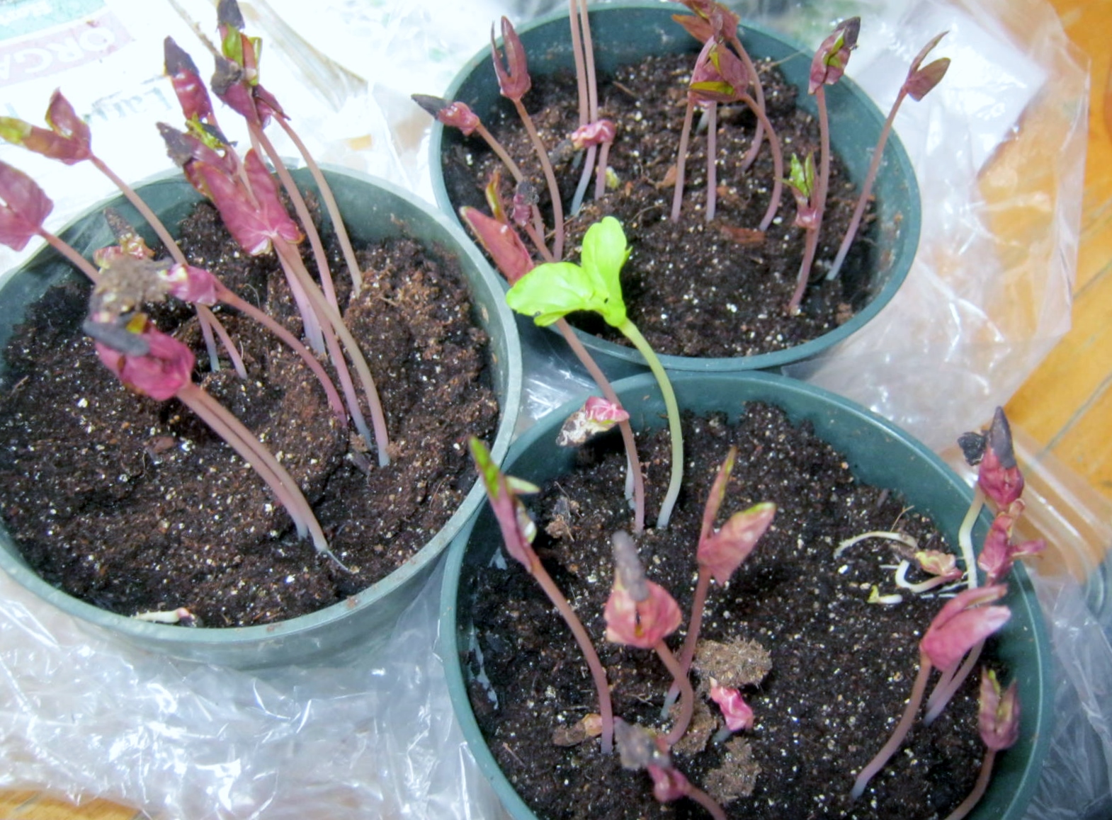 Anyway, it’s a good day for a quick update on my recent plantings. All are doing exceptionally well. The Heavenly Blue Morning Glories sprouted in less than a week. Hooray! If you look closely at the picture you can see I have a “sport.” One sprout a little different than the others. I will definitely keep this one growing. Who knows? It might turn out to the best morning glory ever grown. I can hope!