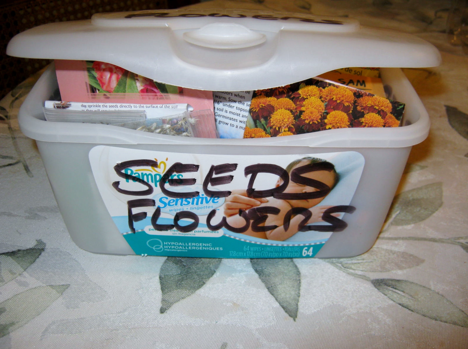 Finally, I file these seed packets, and any leftover seeds from spring, inside a recycled plastic container. In the picture below I’ve used a baby wipes container. These are kept in my refrigerator until I begin to plant once again.