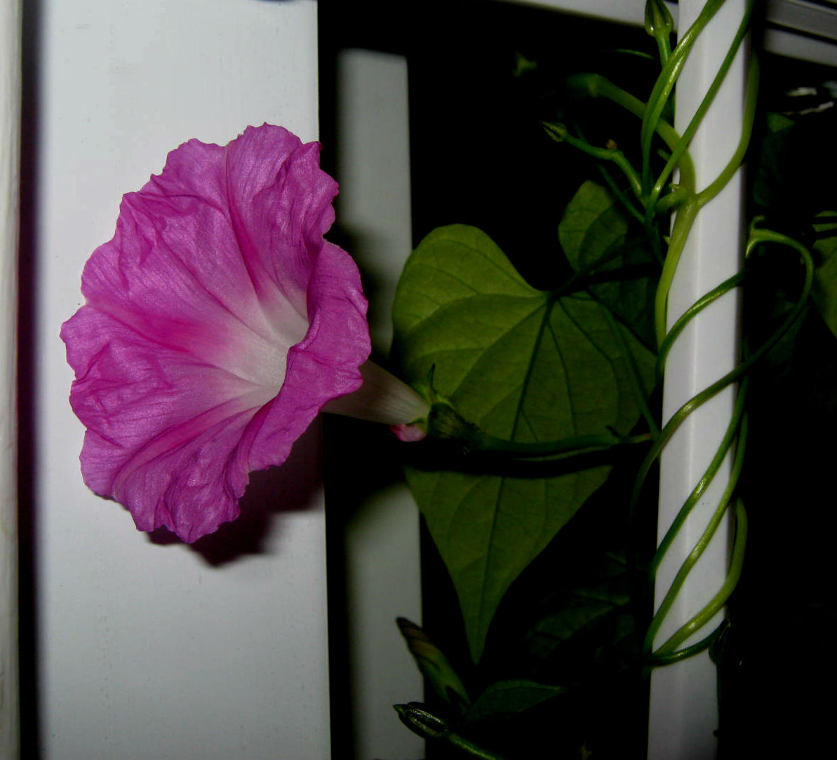 Are my Morning Glories blue or pink? The stray pink Morning Glory was a fluke, most of the flowers are blue. Unfortunately, in their quest to face the sun, the plants and flowers grew toward the window. I decided they would create a better display outdoors.
