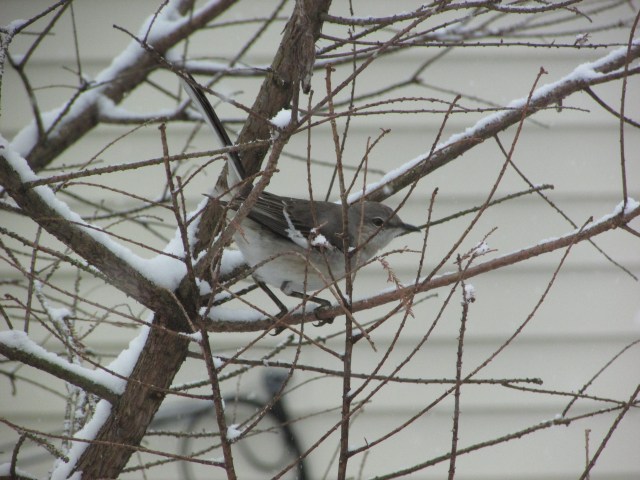 Mockingbirds are a favorite of mine. I captured this beauty outside my window today, perched on a branch of the Bald Cypress tree. The beautiful snow is reason enough to gaze out the window, making eye-contact with a mockingbird is an added bonus. Is it possible to develop friendship with birds, moments of real trust? Possibly this morning was an inroad to even better relationships with the backyard flock. I trudged out in the snow to throw a bit of seed on the ground, and into the feeder hoping to give them a few minutes of nourishment before the snow covered my breakfast offering over again.