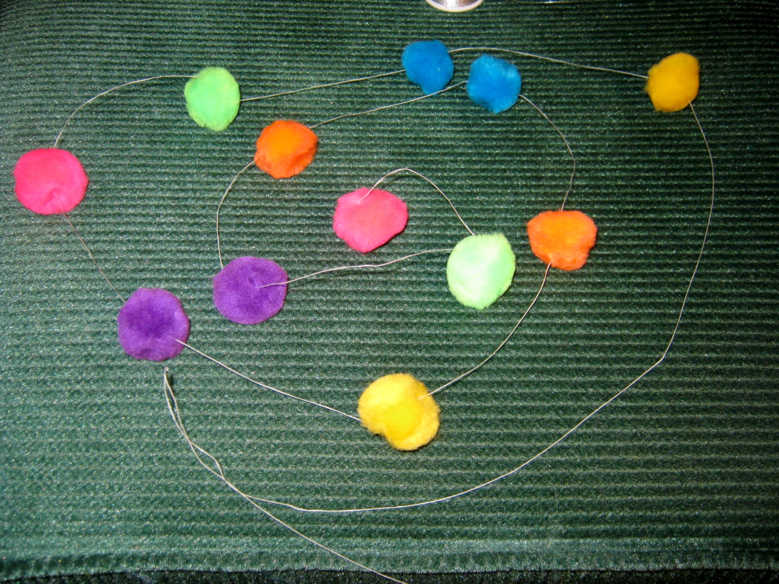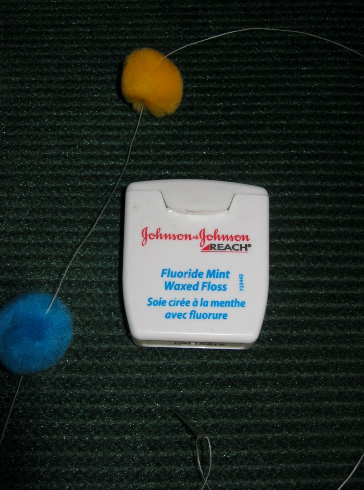 Materials: 1 inch pompoms (other sizes work too) waxed dental floss, large needle, scissors.