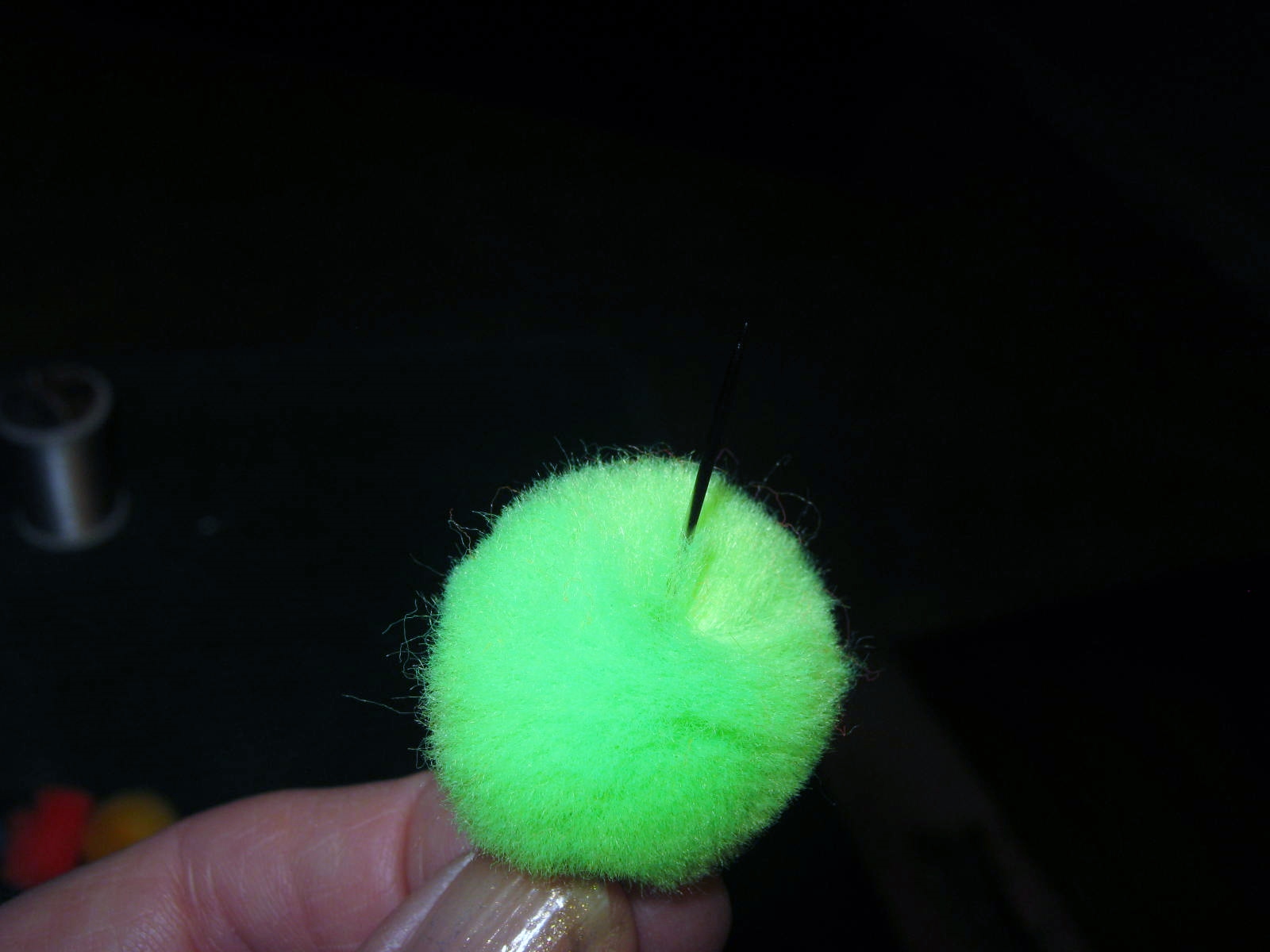 I threaded a large needle with waxed dental floss. The waxed varity helps the floss to slide easily through the center of the pompom.