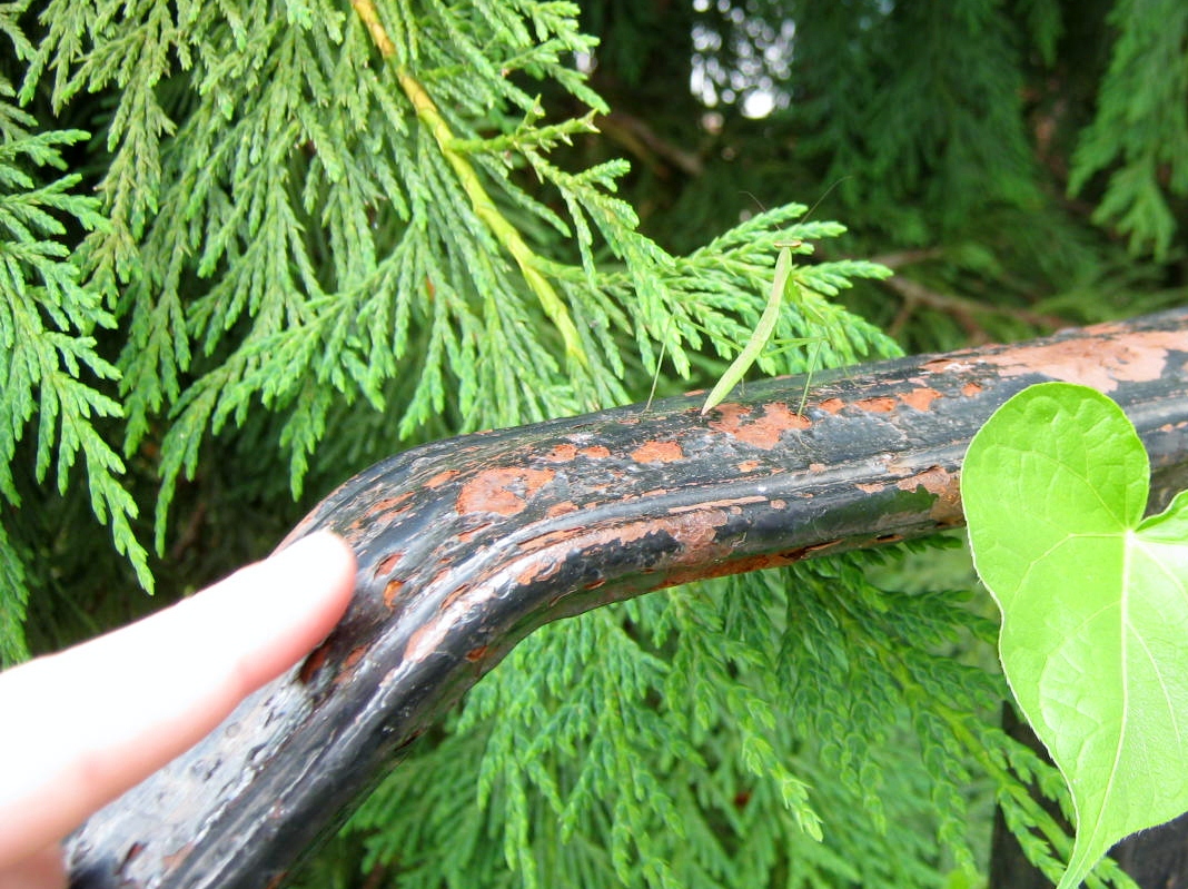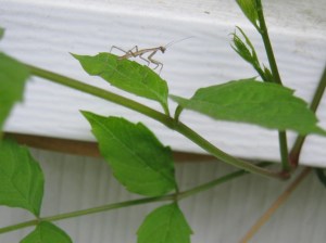 I have mixed feelings about the praying mantis. I want a mantis in my vegetable garden to keep cabbage moths and other destructive bugs at bay, but I don’t want to lose any beneficial or beautiful creatures to their powerful forelegs and mandibles. Praying mantis in the garden are definitely a mixed blessing.