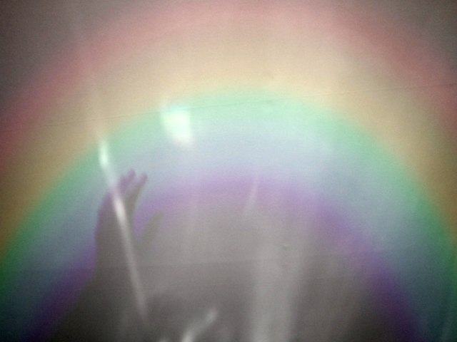 A week or so ago, on a day when I had made some major changes in everyday goals, amid constant prayer for a loved one struggling through the last days of a battle with cancer, I walked into the room I craft in and found an unexpected rainbow across a good quarter of the ceiling.