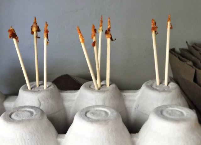 I fill the bottom of the carton with 1 1/2 inches of sterile organic potting soil. On top of the potting soil I add an equal amount of organic seed starter soil.