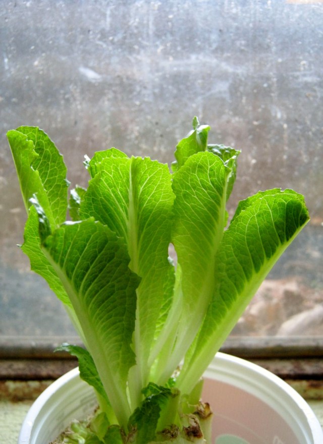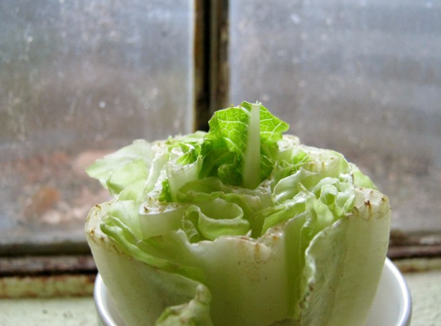 For those concerned about transplanting – most plants that do well with this re-rooting method (which is what you’re doing – the plant had roots at one point, the grower or the store cut them off, and it’s still living (if it weren’t the whole thing would either be very slimy or paper-dry), so it’s ready to re-grow roots. If you want to transplant to dirt, start it first in a dish of sand, potting moss, or vermiculite (from a garden-supply store), or a ‘rooting medium’, which is a mix of those ingredients, and keep it very moist. Then when you see leaves start to grow, transplant to your garden or to a pot of dirt. I haven’t tried this with lettuce yet (although I will now that I’ve read this!!), but I have with other plants. Some will grow, some won’t, depending on how recently they were picked.