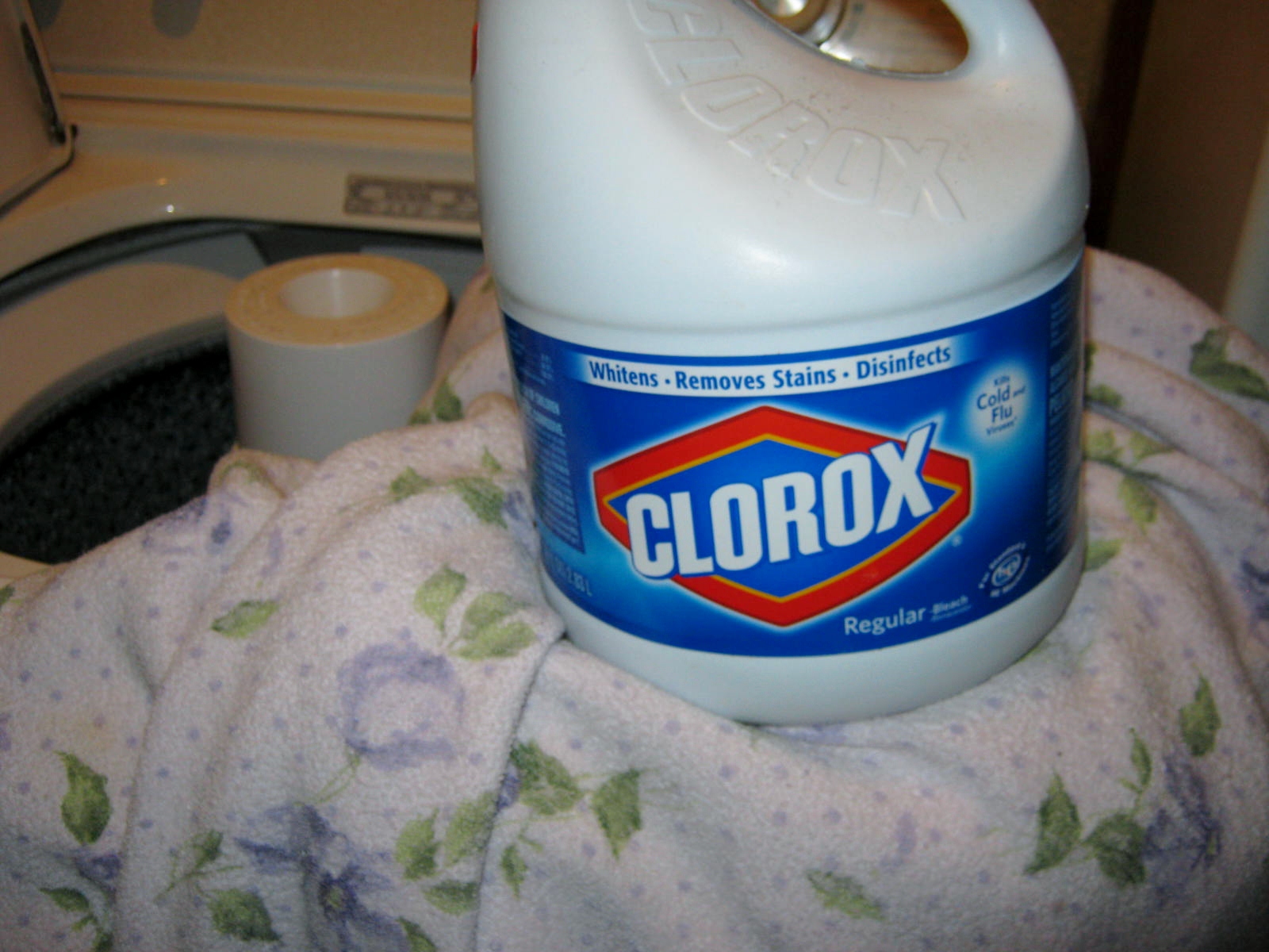 A big problem in the laundry room can be bleach spots. Yes, I am sure you know the scenario if you’ve ever used beach, I am talking about the despicable and horrifying spot of bleached out color you often find on a pant leg or sleeve after using this super whitening agent. The cause is usually a bead of bleach running down the side of the bottle after pouring. This small droplet is usually not noticed by the person using the bleach. The run-off is then accidentally brushed by the cuff of a sleeve, or drips off the bottom and mars the leg of your pants.