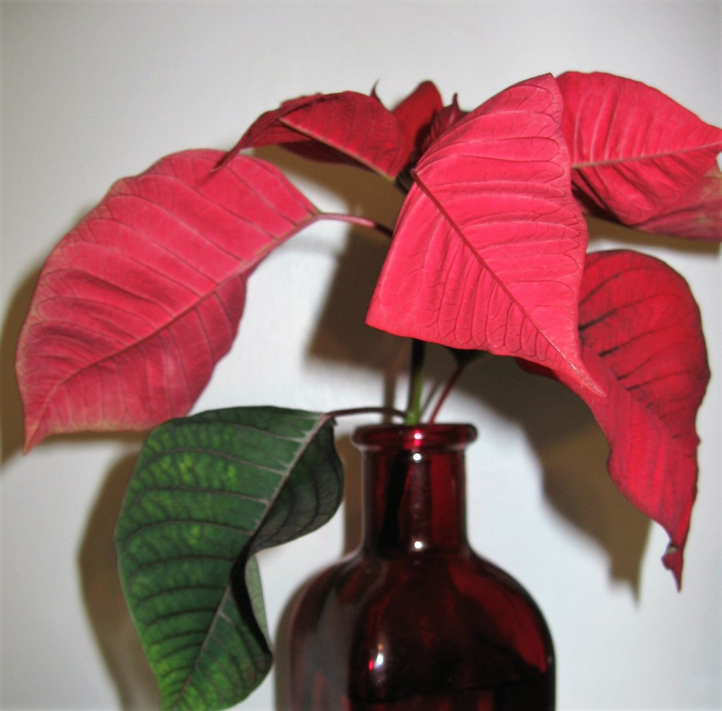 If you don’t find a broken stem you can always harvest one from the back of your plant for a vased arrangement. My Poinsettia cuttings are over a week old, and I am hoping they will eventually develop roots. Oh the JOY, another experiment to try. Keeps me going. Merry Christmas to you.