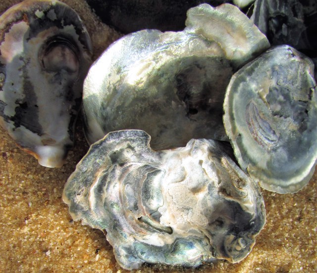Where there is rain you will find rainbows. Although I didn’t see a rainbow in the sky, the upturned oyster shells scattered by the surf on the beach reflected a brilliant iridescence, the only rainbow I found.