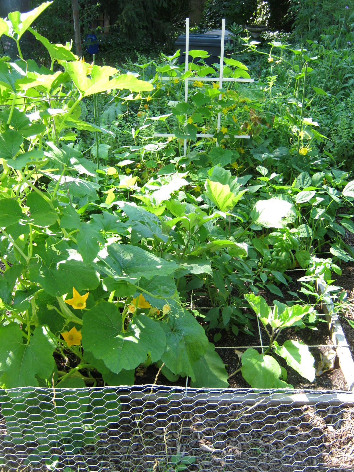 So far, the only antagonist to my garden joy is the yellow squash. There have been many flowers, and several small squash, but all developed blossom rot. I’ll read up on this problem and apply what might help. If I find a solution that works I will post the results. Here’s a photo of another squash, white squash, I am hoping it will perform better.