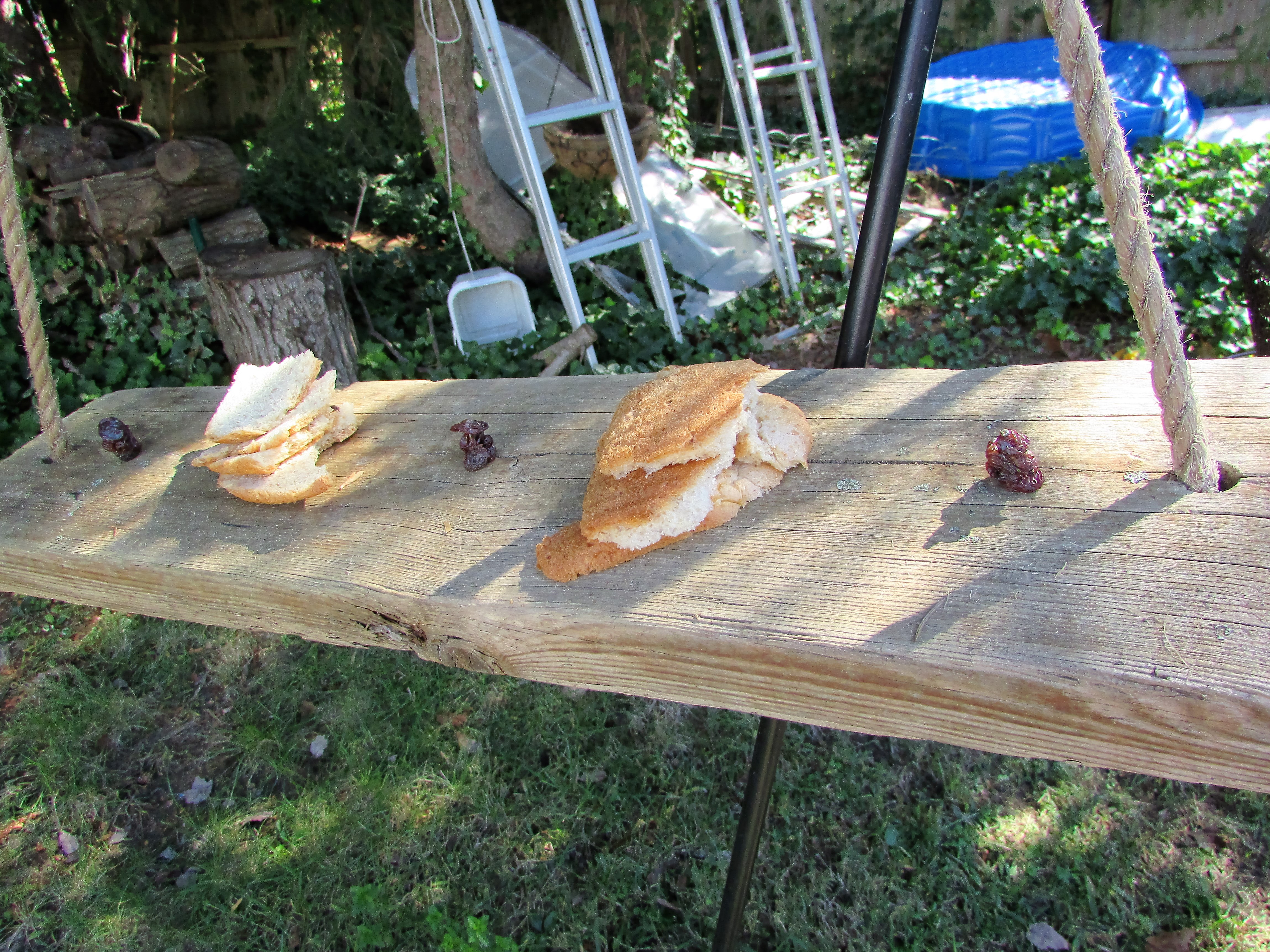 I also made use of an old swing with ropes still attached, and hammered a few small nails into the length to anchor down raisins, bread and fruits.