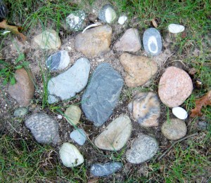 I decided this summer that I really must go through all the shells, rocks, mosses and other natural items I had stockpiled in the garage during the twenty-five years we have lived in this house. I have made a dent in the collection. In the spring I created planters with a border of seashells, and in the last few weeks I have been creating stepping-stones with my huge rock collection. I love to step along the stones and relive the feel of walking across them on the beaches, bays and creek beds where they were gathered.