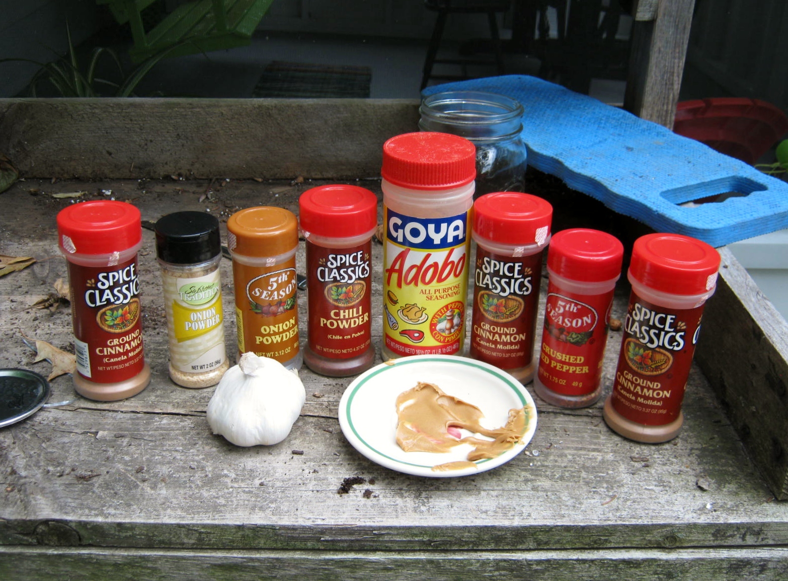 I used up all my pungeant spices and baited the Christmas balls with a peanut butter glue coated with garlic, salt, onion powder and Adobo spice. For good measure I pounded a clove of garlic with a hammer and strew it in between all the tomato plants.