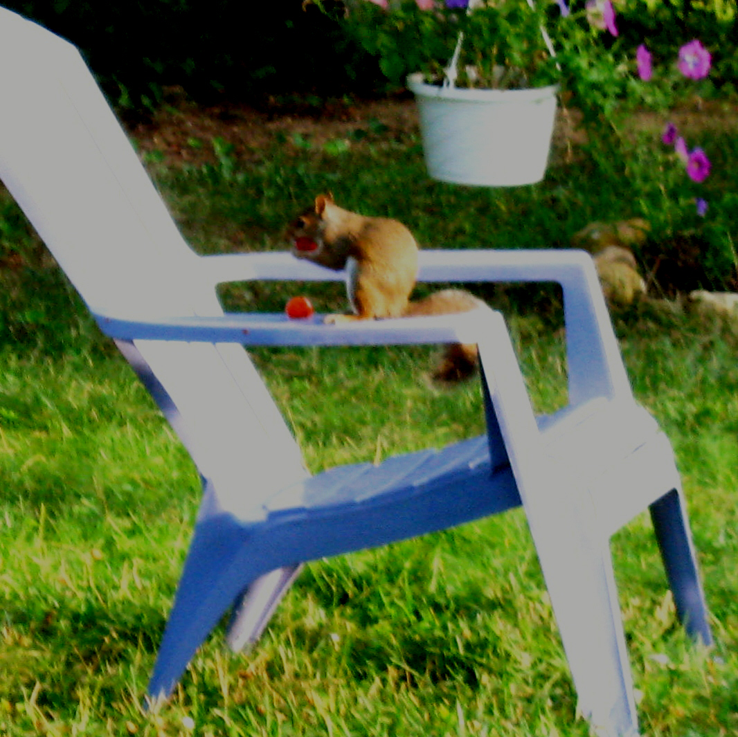 I spied this cheeky fellow on my lavender adirondack, eating one of my cherry tomatoes with another one waiting at his feet.