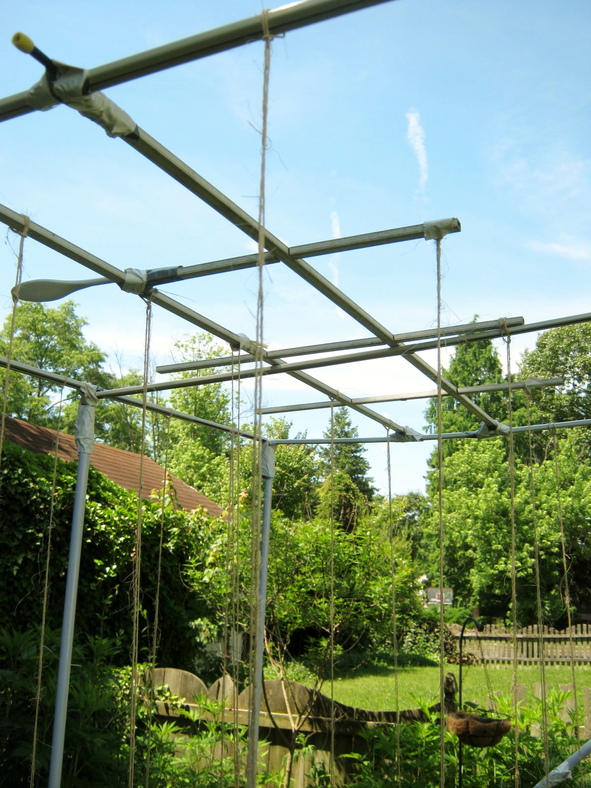 My junque trellis is not pretty, but oh my, it is interesting! Best of all, the basic concept works perfectly. We have already had heavy rains and not a curtain rod or handle has budged a millimeter. I LOVE DUCT TAPE!