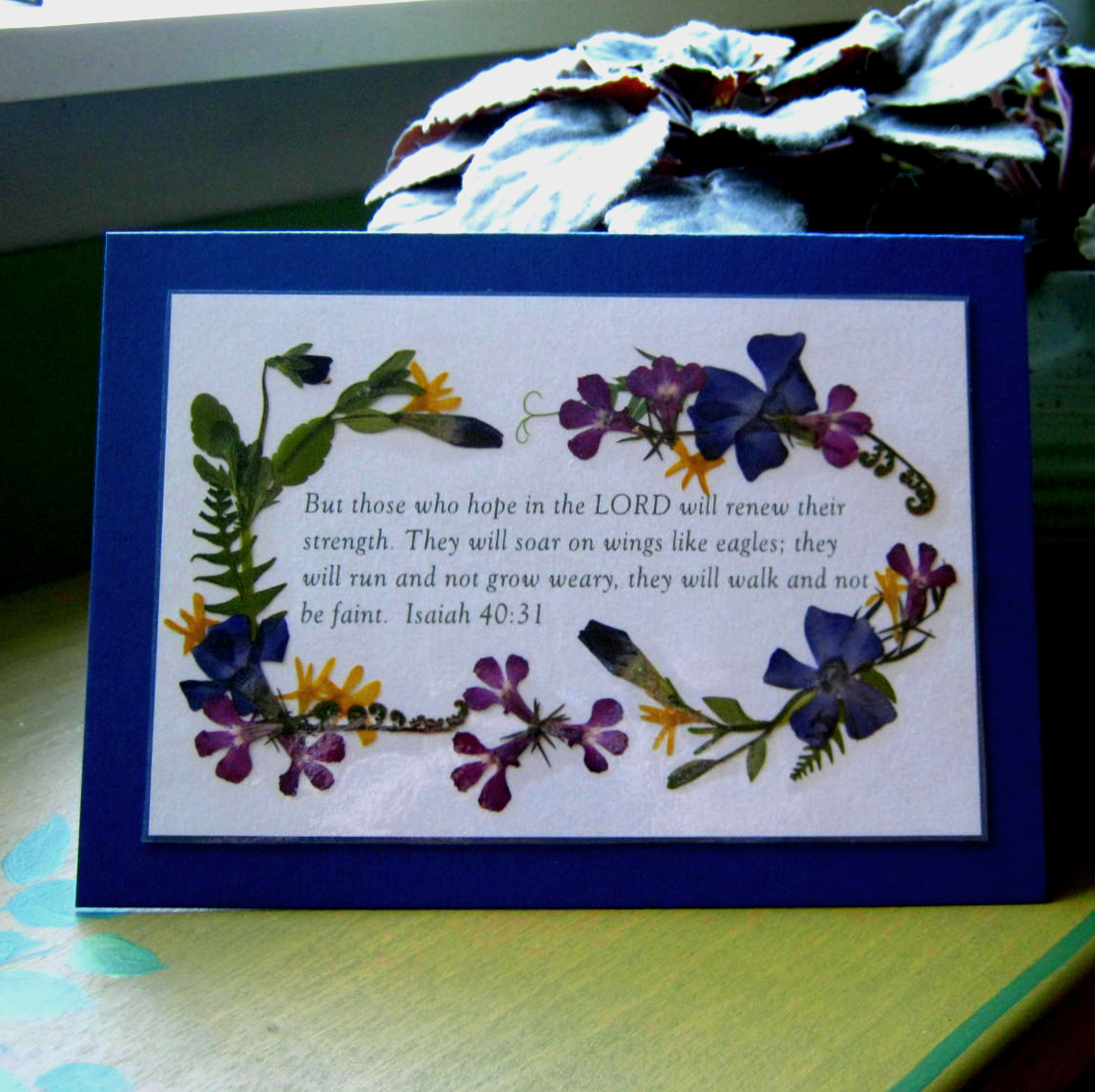 I’ve been creating pressed flower greeting cards using some of my stored pressed flowers combined with favorite Bible Verses. I think the two go together well. The flowers on the card front are: florets from the top of a marigold bloom, magenta lobelia, vinca, ferns and other wildflower foliage.