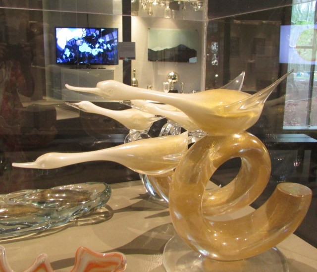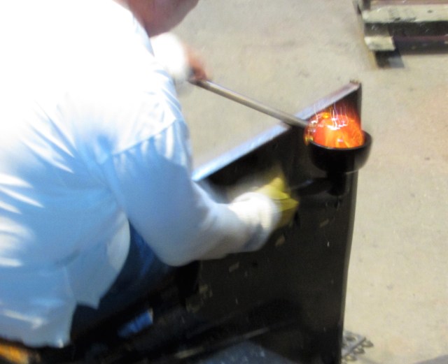Our next stop was the glassblowing studio. You can feel the heat in the building. The glow of the furnaces as sand is turned to liquid is so bright and hot it is impossible to gaze at it for any length of time. You can see the heat and glow reflected on the back of one of the glassblower’s shirts.