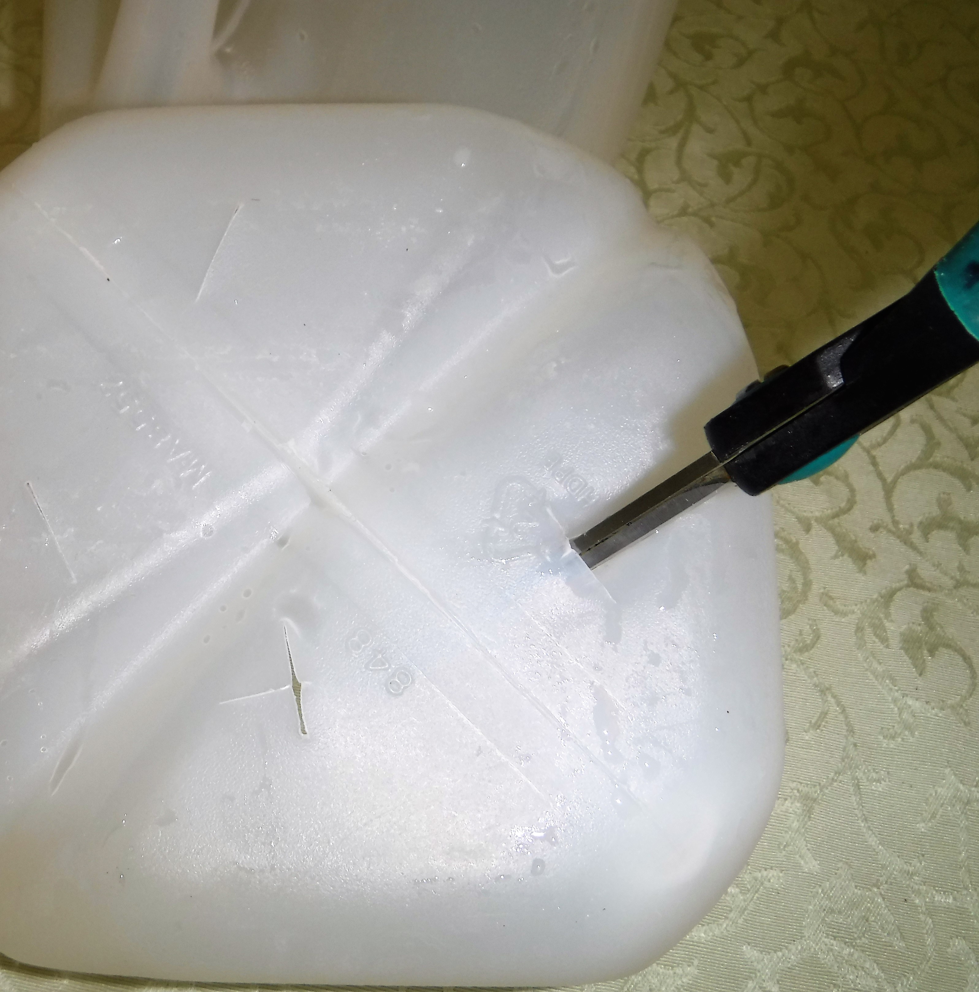 2. Cut the container in half, leaving a small tab to keep the two halves connected.