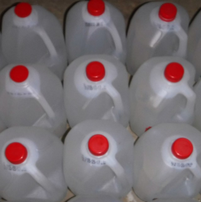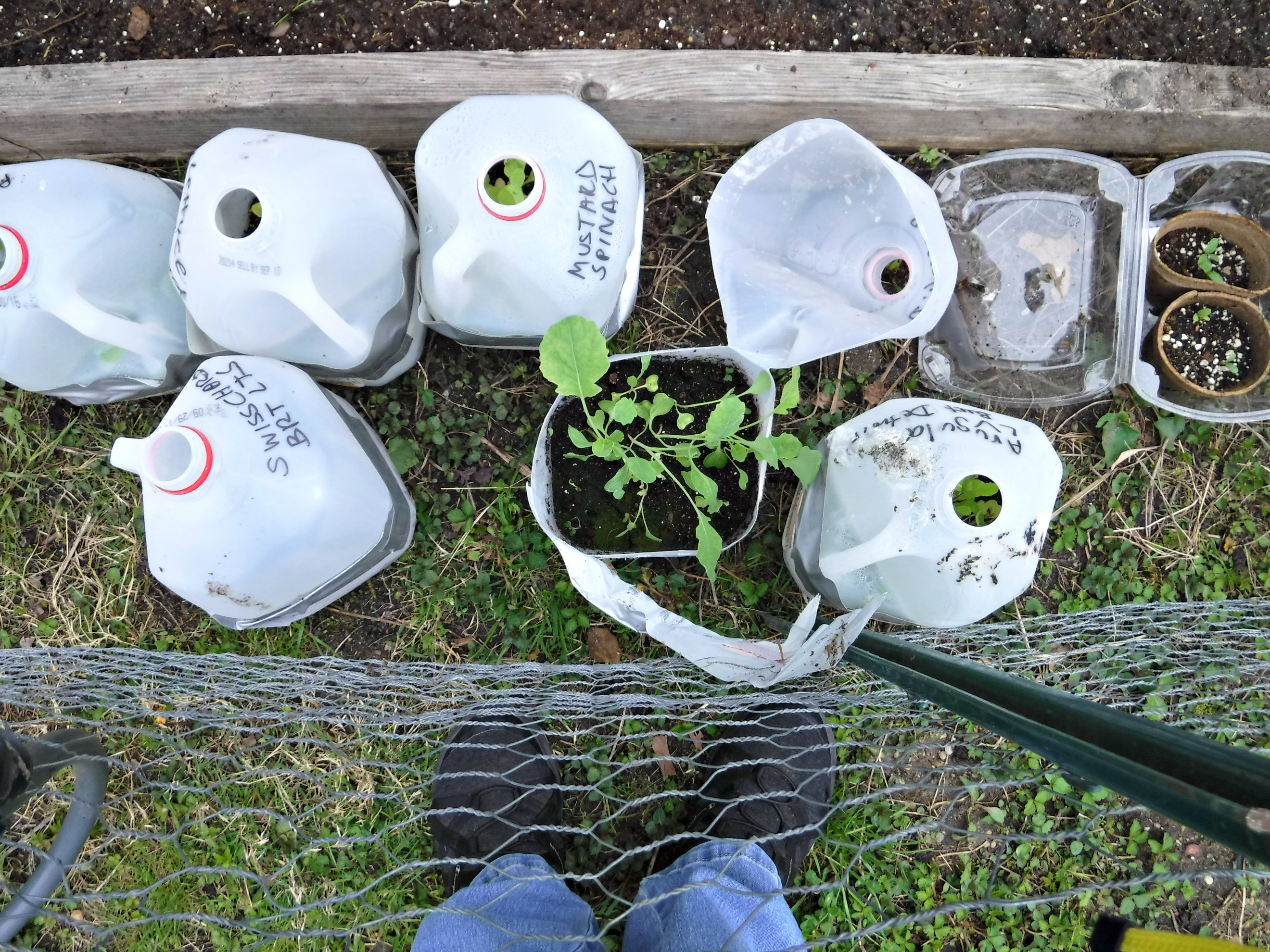 A view of some of the sprouts inside their containers. The above photos show my recycled orange juice bottles. These mini-greenhouses are light in weight. To windproof them I wedge them in among the heavier milk jugs. (I don’t use small containers anymore, they dry out too quickly. I try to use gallon-sized or larger containers.)