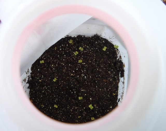 A bird’s-eye-view through the top of a milk jug. The seedlings inside are asters.