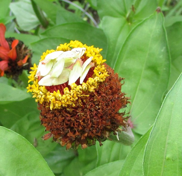 Zinnias have “Heads composed of both disc and ray flowers, with disc flowers tightly packed together in the head’s “eye,” while enlarged ray flowers function as petals radiating outward from the eye.” Composite Flowers – Backyard Nature