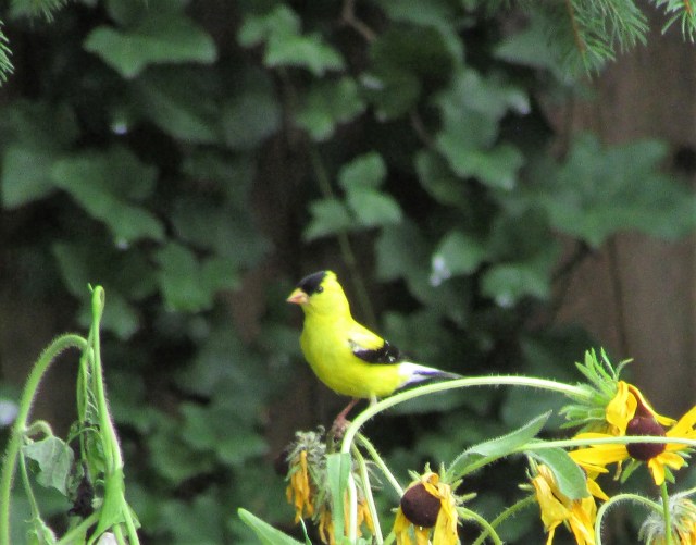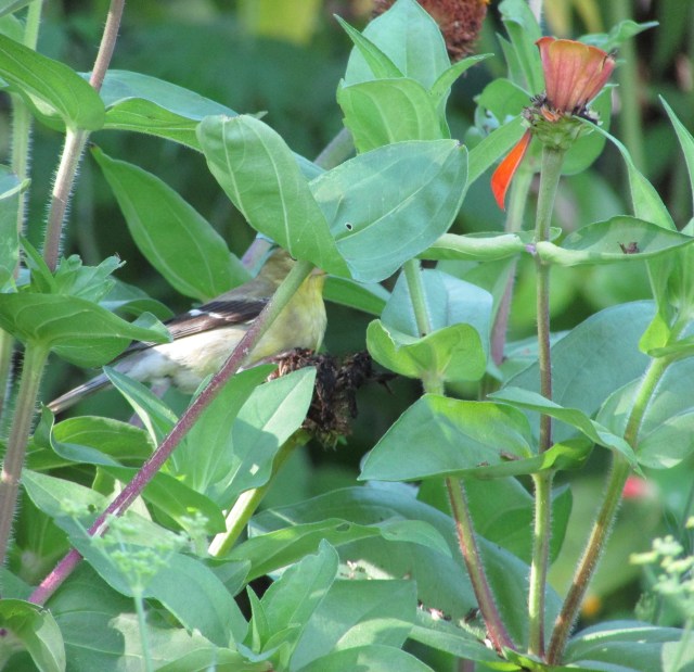 Goldfinches are the bandits. The male is bold and brash, watching me carefully, but staying in plain sight.
